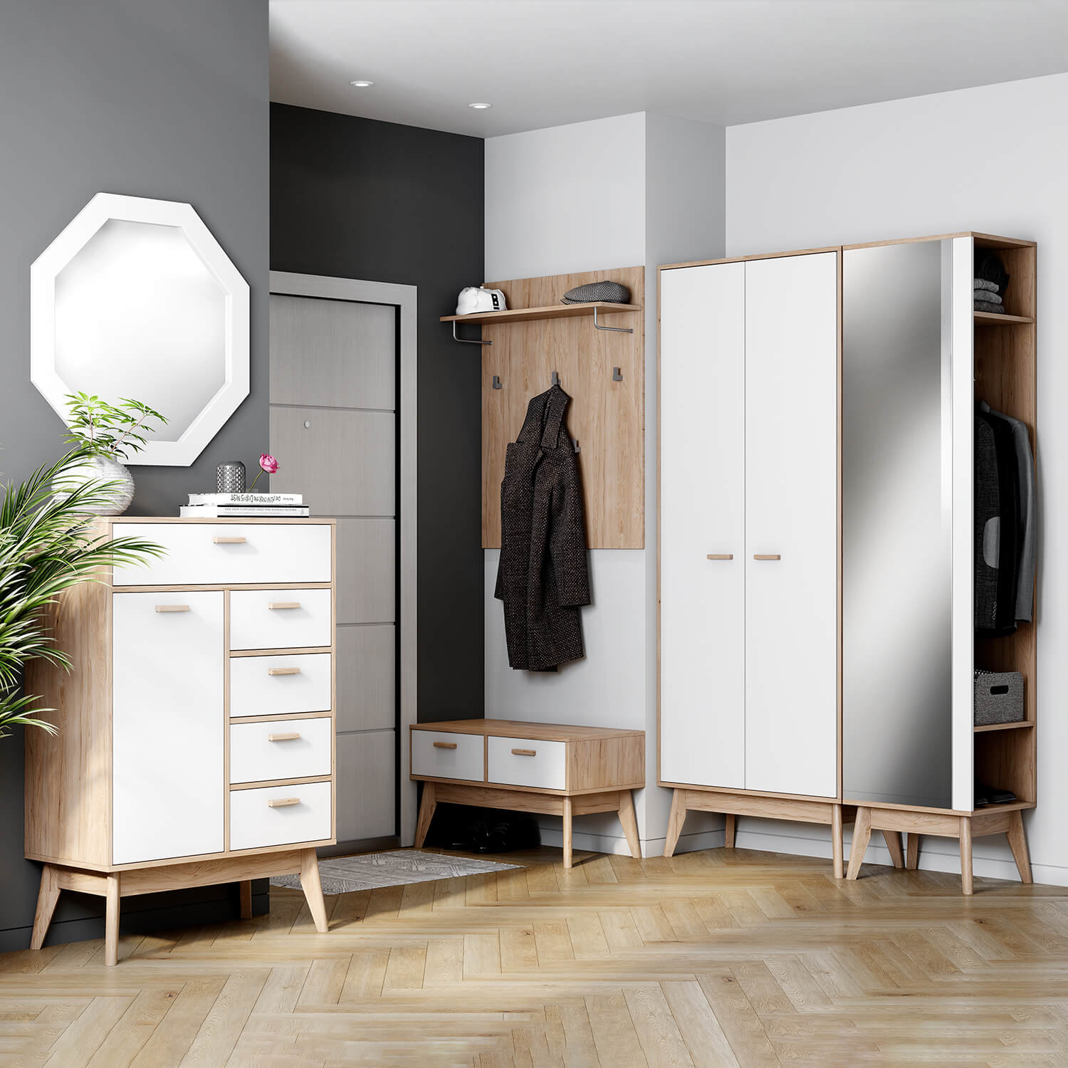 Прихожая "Калгари" выполнена в полюбившемся многими скандинавском стиле. Основной тон белый, именно он отвечает за визуальное увеличение пространства, поэтому прихожая будет выглядеть светло и уютно, просторно будет даже при небольшой площади.