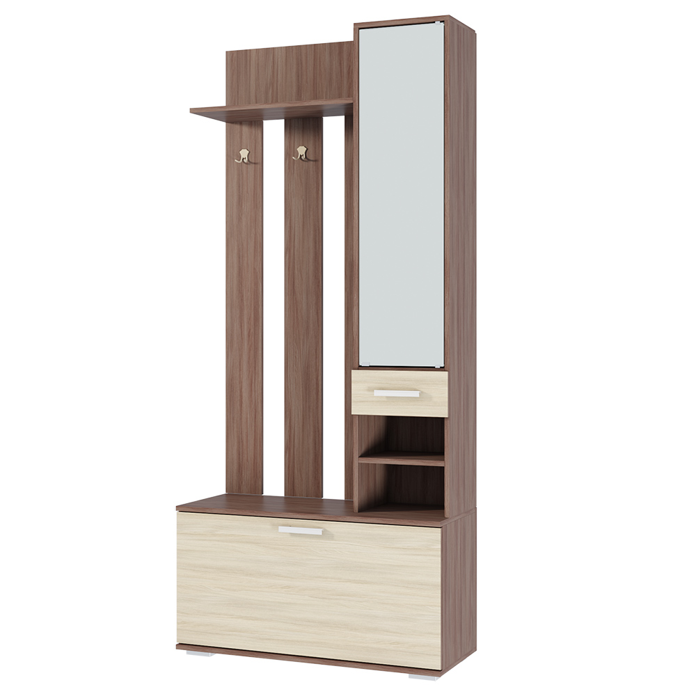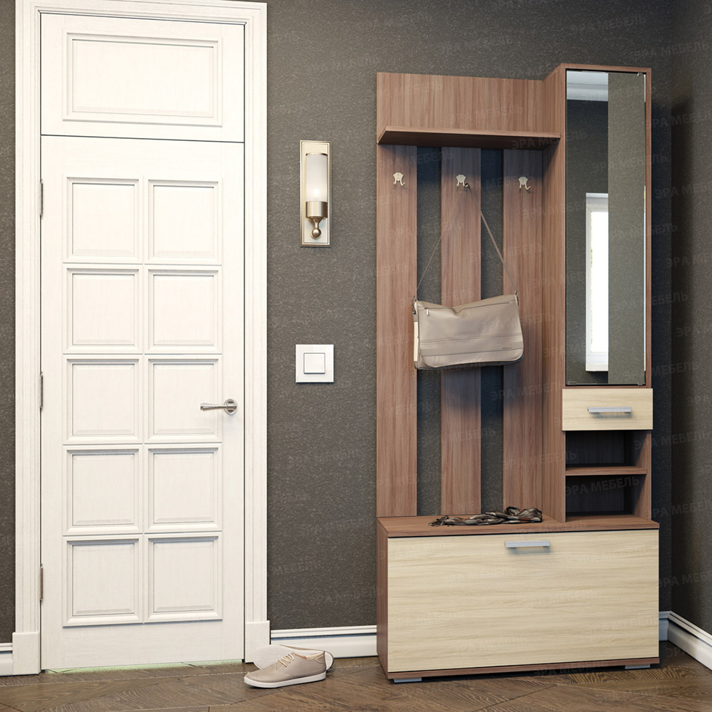 Цвет вешалки выполнен в приятных бежевых и коричневых тонах, имитирующих натуральный материал - ясень шимо. Материал фасада - ЛДСП, который не реагирует на воду, что делает его более устойчивым к влаге.