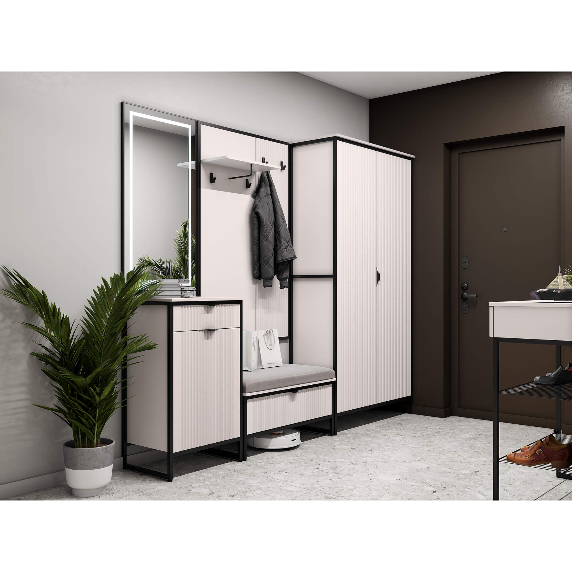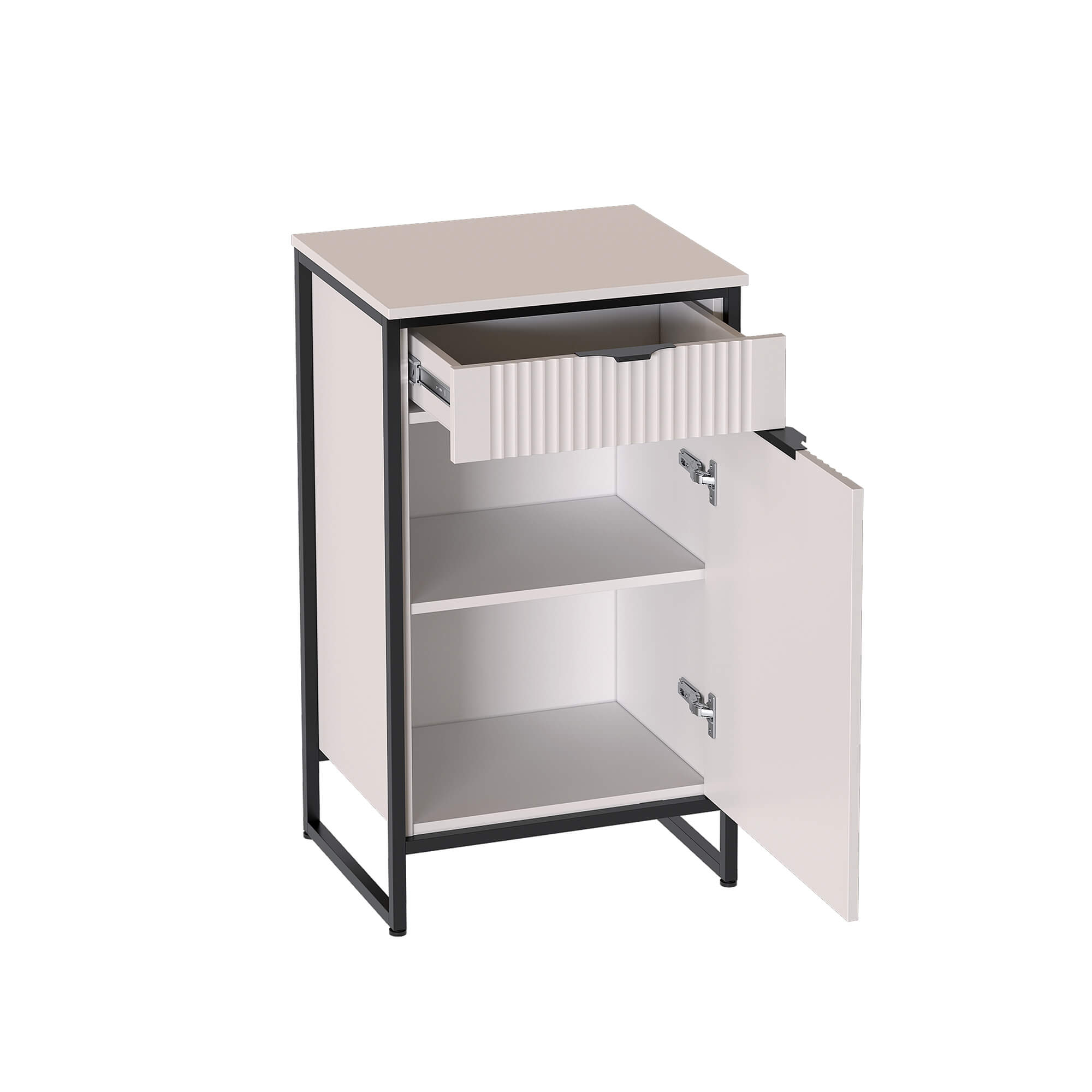 В верхней части тумбы установлен выдвижной ящик на шариковых направляющих с доводчиками. Нижняя часть тумбы закрыта распашной дверью, за которой установлена съёмная полка. Дверь может устанавливаться, как на правую, так и на левую сторону и оснащена петлями с доводчиками.