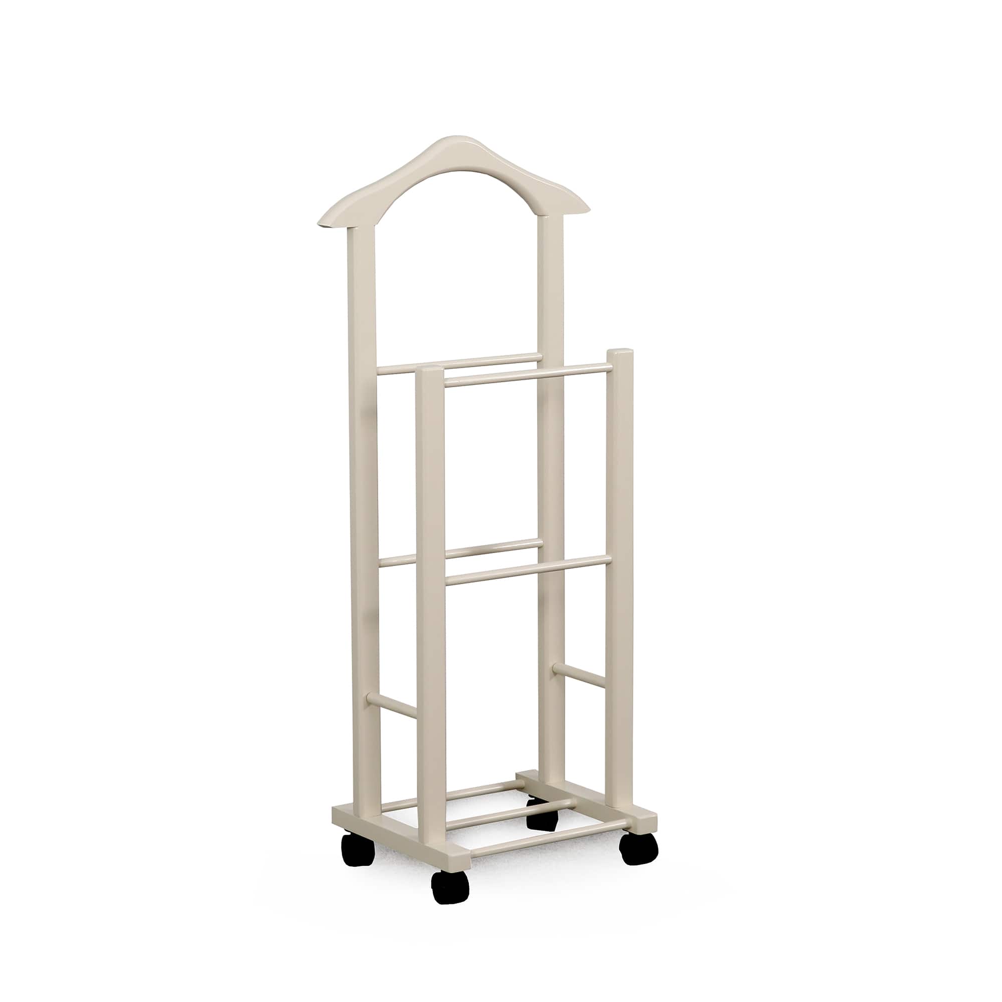 Более высокая стойка высотой почти метр и шириной почти полметра имеет закруглённую верхнюю планку. Такая форма удобна для навешивания одежды с рукавами, а габариты вешалки позволяют размещать наряды даже очень крупных пользователей. На нижней планке удобно расположить брюки и юбки.