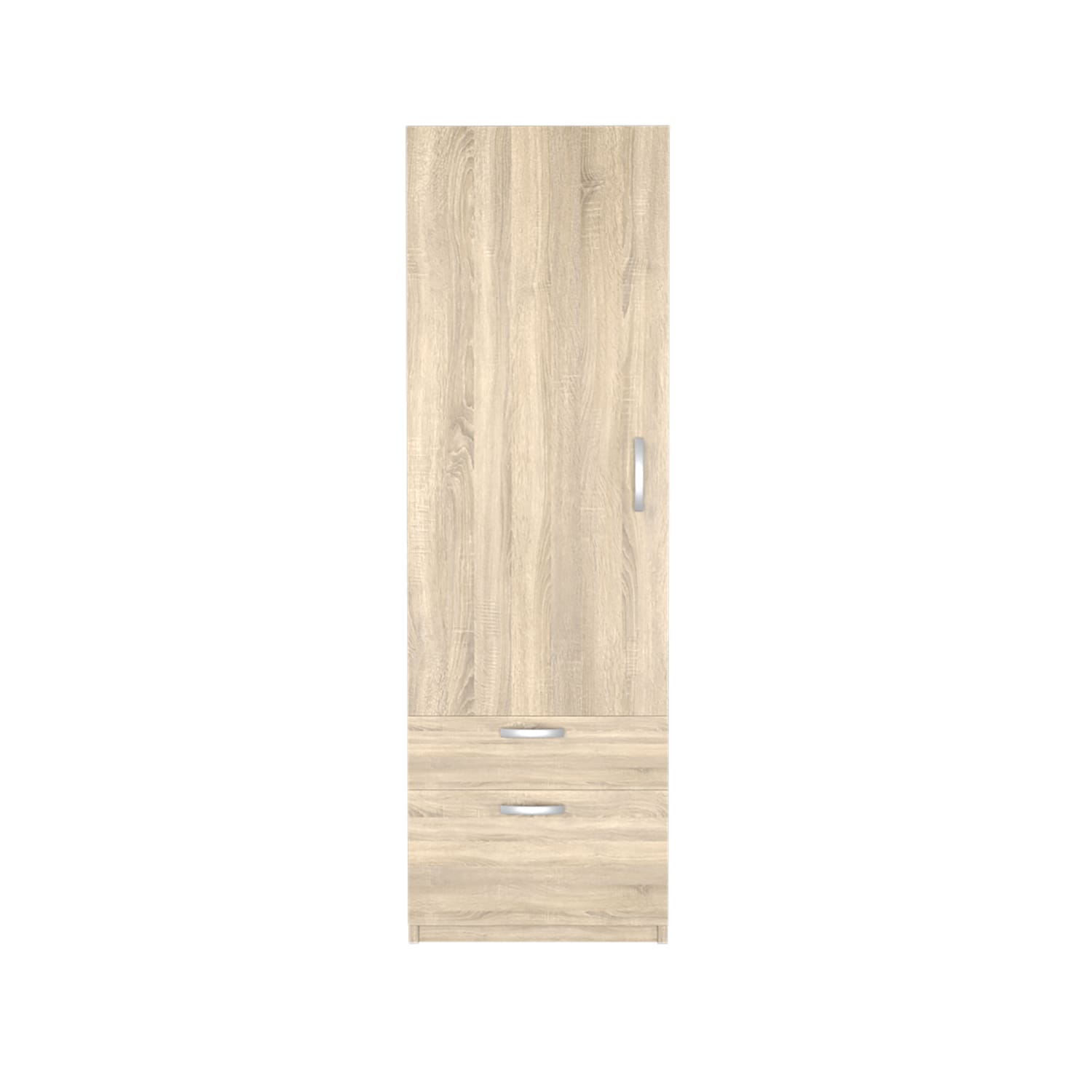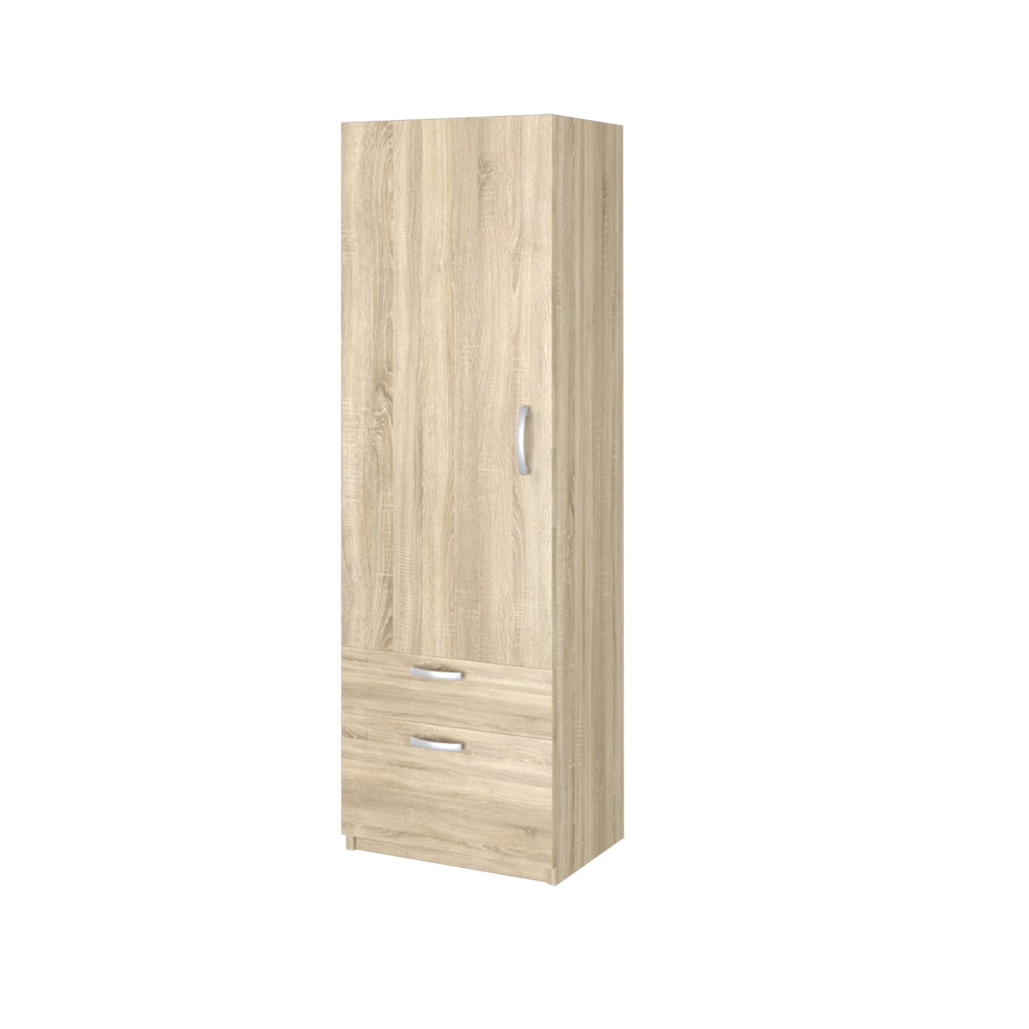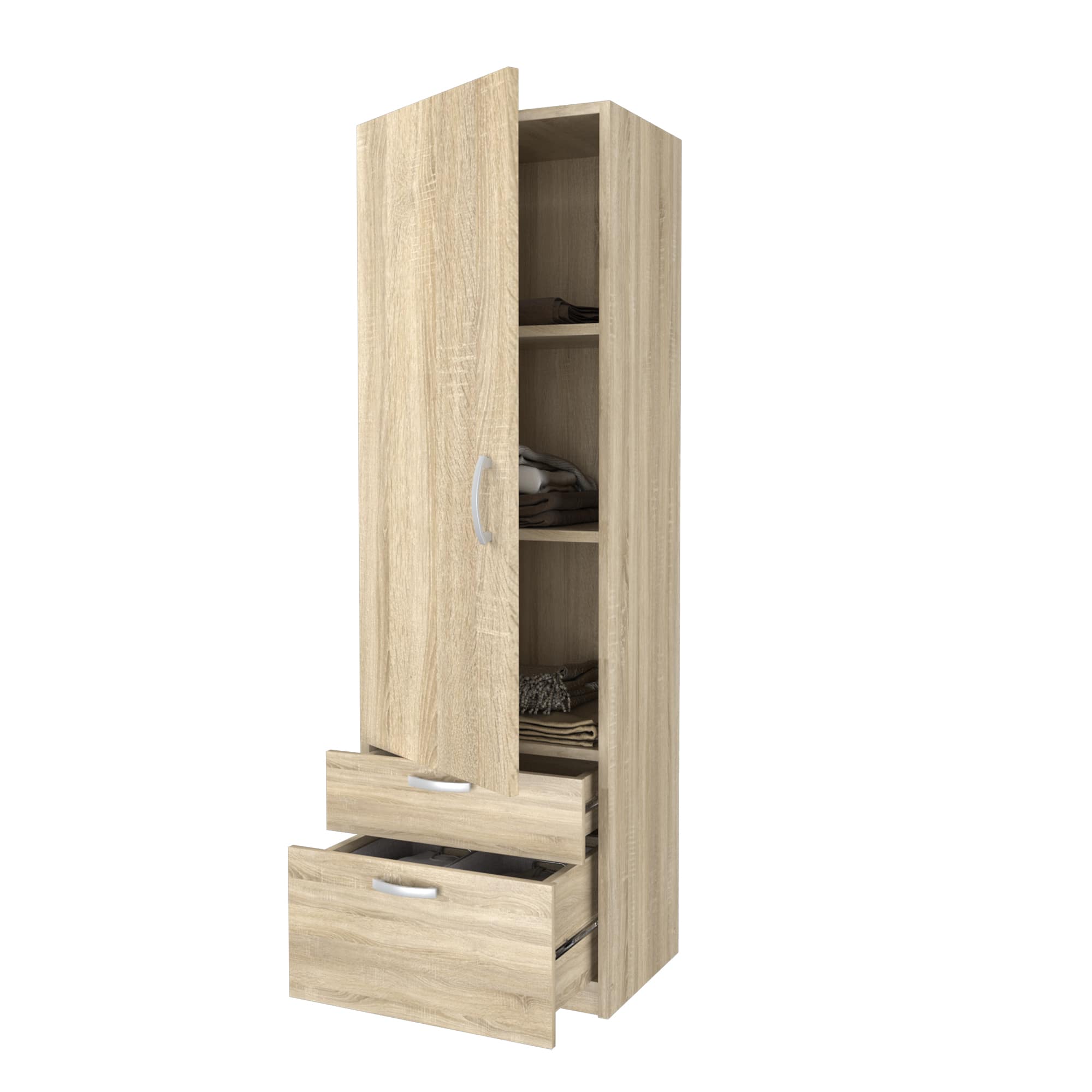 Шкаф имеет одну распашную дверь, которая открывается на себя. Внутри шкафа расположены две полки и два ящика, что обеспечивает достаточное пространство для хранения вещей.