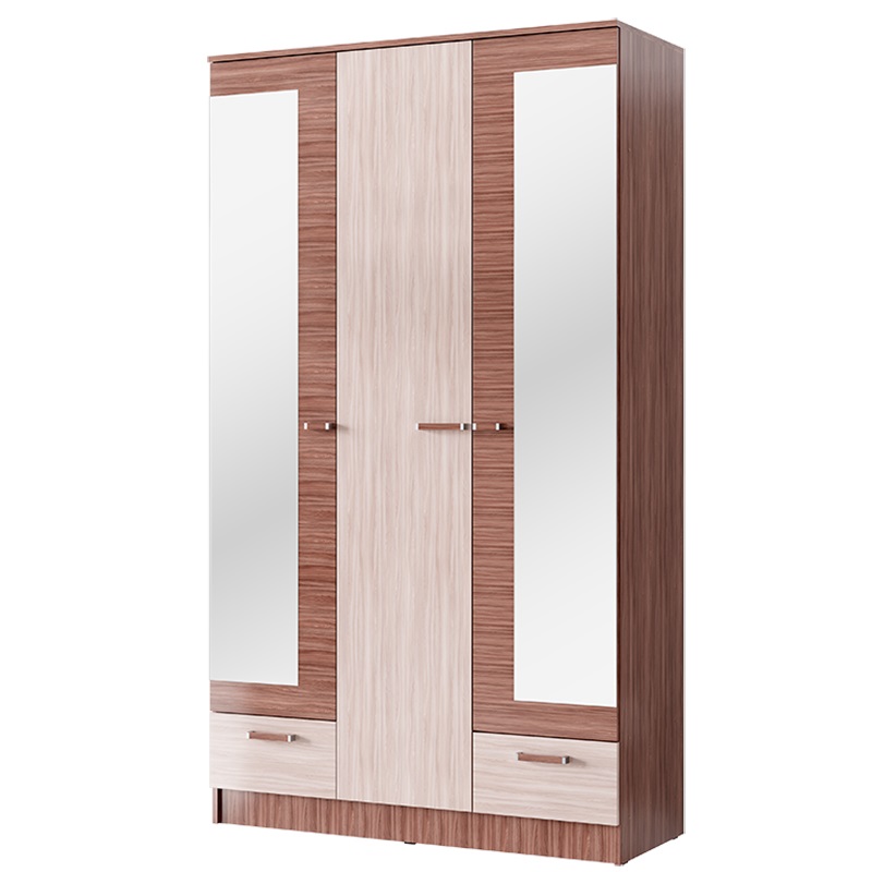 Три распашные двери шкафа обеспечивают удобное размещение предметов гардероба, а внутри шкафа находятся четыре полки и два ящика для дополнительного пространства хранения.