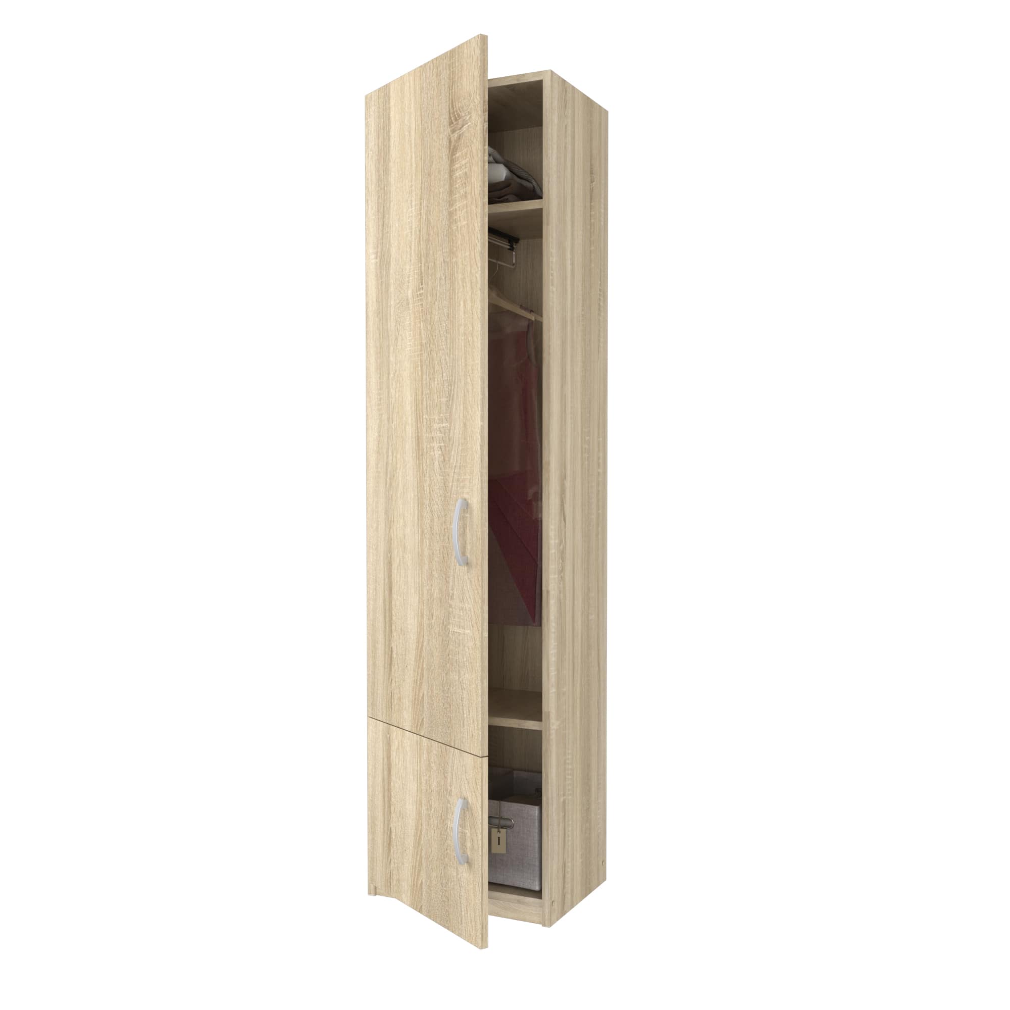 Конструкция шкафа предусматривает две секции и две распашные двери, что обеспечивает удобный доступ к содержимому. Внутри шкафа находится штанга для вешалок, на которой можно разместить верхнюю одежду.