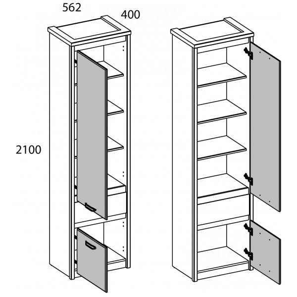 Шкаф 2D1S JAZZ – универсальный предмет мебели, который оформит привлекательный интерьер и молодёжной комнаты, и гостиной, а также спальни (например, в сочетание с угловым шкафом 2D). Модуль организует компактное хранение белья, предметов одежды, учебных принадлежностей и других вещей. Конструкция элемента представляет собой одно отделение с полками из ЛДСП за глухой дверью, одну вместительную нишу за глухой дверью, один выдвижной ящик (1S). Двери распашные, крепятся на петли к боковому корпусу.