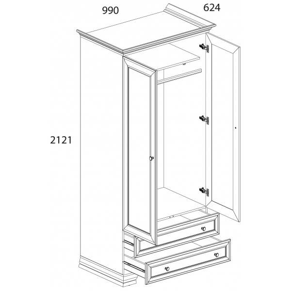 Шкаф 2DG2S TIFFANY Белый прекрасно подойдёт для оформления спальни, молодёжной, гостиной и прихожей. Конструкция шкафа 2DG2S TIFFANY Белый прямая, представляет собой одно гардеробное отделение с полкой и стационарной продольной штангой за двумя глухими дверями, два выдвижных ящика (2S). Сверху расположена ниша для хранения головных уборов, предметов быта и других вещей. Двери (2D) распашные, крепятся на петли к боковому корпусу изделия.