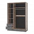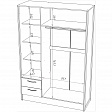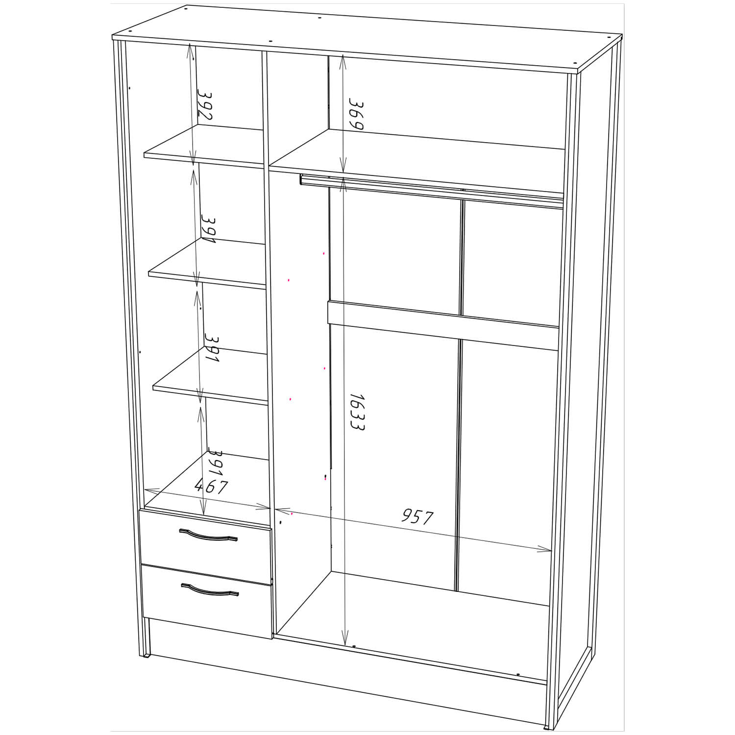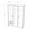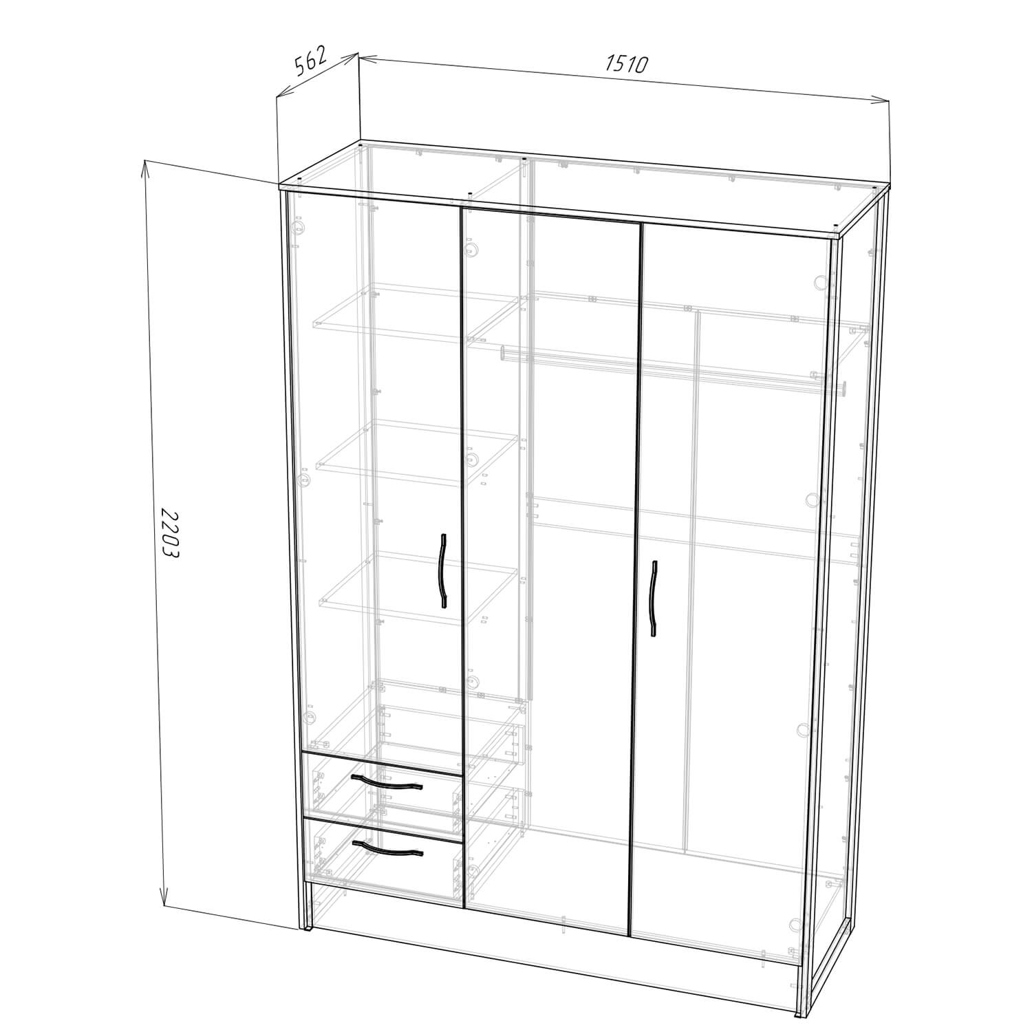 Особенностью шкафа является наличие 3 распашных дверей, 4 полок и 2 ящиков на шариковых направляющих полного выдвижения. Это позволяет удобно разместить одежду, обувь и другие предметы.