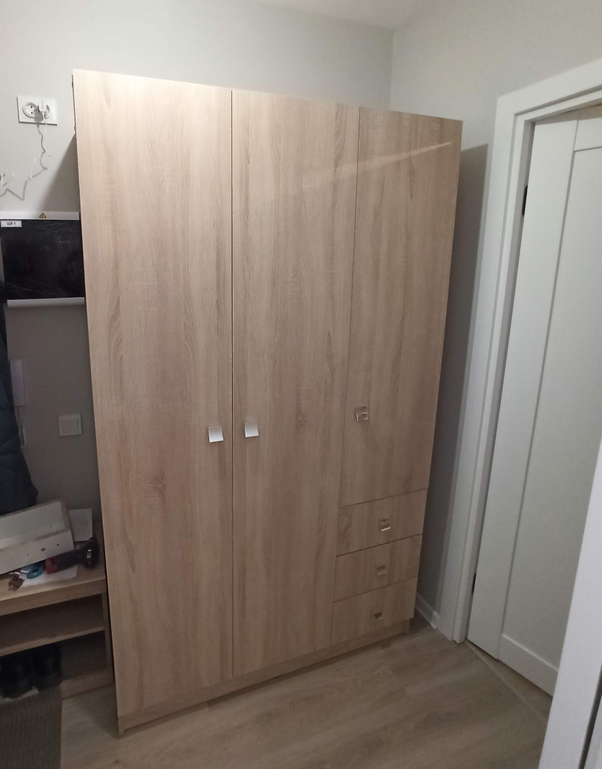 Шкаф распашной «Лофт» — это не только функциональное решение для хранения вещей, но и стильный элемент декора. Три отделения шкафа позволяют удобно организовать пространство комнаты и разместить все необходимые вещи. На полках шкафа можно разместить сложенную одежду, а на штанге — верхнюю одежду. В трех вместительных выдвижных ящиках можно хранить мелкие вещи. Регулируемые скрытые под цоколем опоры придают устойчивость всей конструкции шкафа.