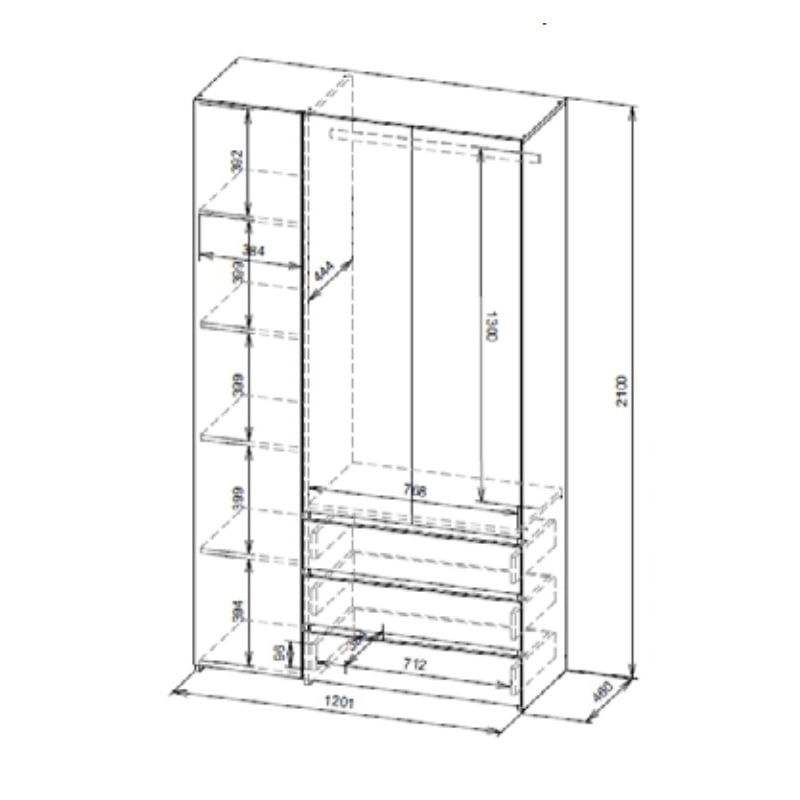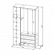 Шкаф трехстворчатый c распашными створками и с тремя выкатными ящиками на шариковых направляющих. Над ящиками центральный отсек для хранения со штангой. За левой створкой расположены четыре полки. Створка открывается при помощи толкателя. Фасады накладные.