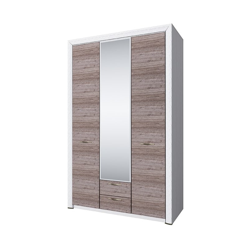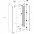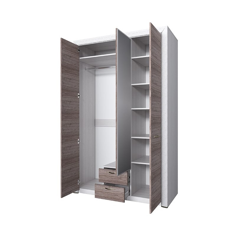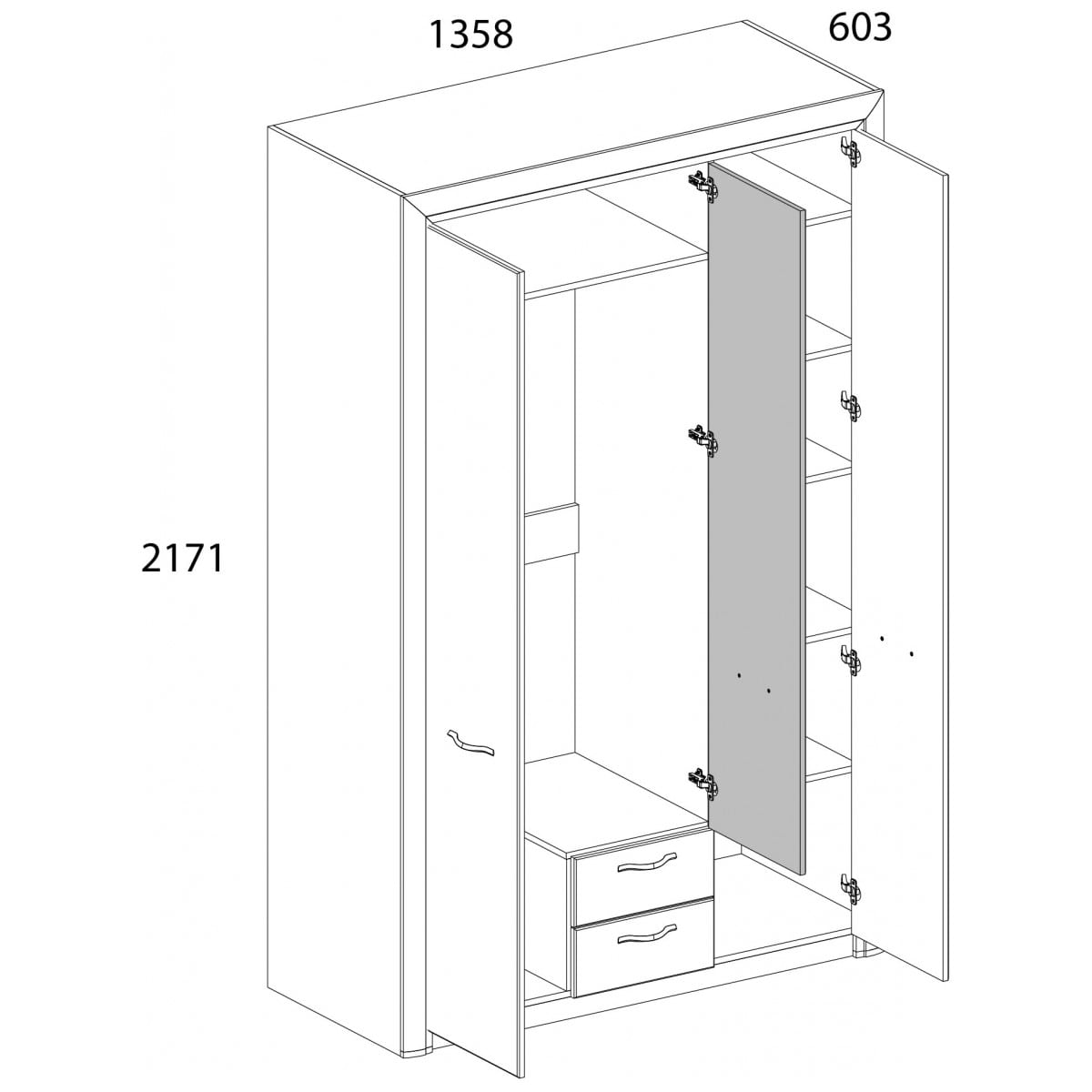 Шкаф 3D2S для спальни. Имеет три двери (3D), дополнительную комодную секцию - два выдвижных ящика (2S). Шкаф 3D2S прямой. Дверцы распашные, крепятся на петлях к боковинам и внутренней перегородке. Одно отделение (гардеробное) для одежды с одной штангой, одно отделение с вместительными глубокими полками для белья, одежды и других предметов. Сверху расположена вместительная ниша для хранения головных уборов.