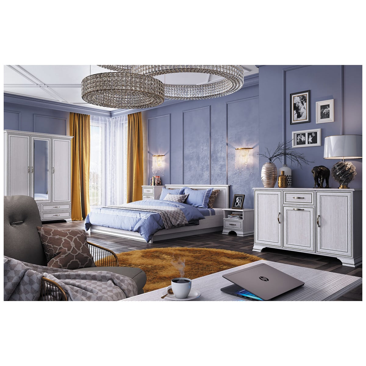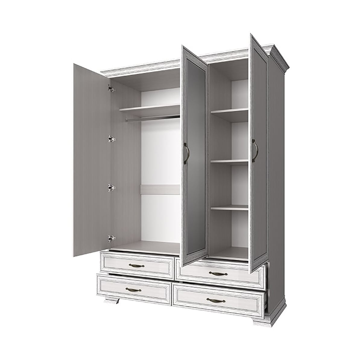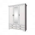 Шкаф Тиффани 3D4S для спальни. Имеет три двери (3D), дополнительную комодную секцию – четыре выдвижных ящика (4S). Шкаф 3D4S прямой. Конструкция элемента представляет собой одно гардеробное отделение для одежды с одной штангой и вместительной нишей для головных уборов и других вещей за глухими дверями (на средней двери снаружи закреплено зеркало), одно отделение с полками для белья, одежды и других вещей за глухой дверью. Дверцы распашные, крепятся на петли к боковому корпусу и внутренней перегородке.