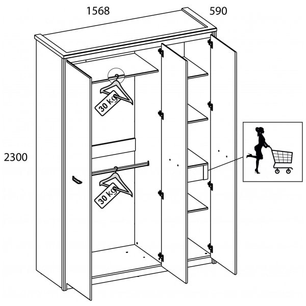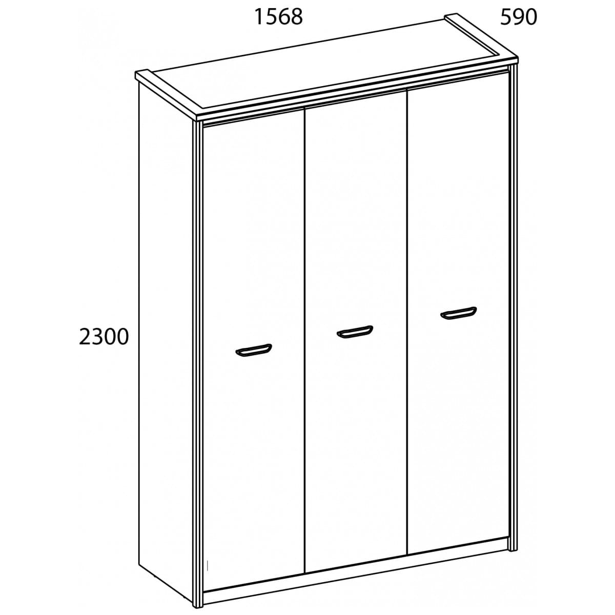 Шкаф 3DG JAZZ – обновленная модель трёхдверного шкафа. Шкаф 3DG имеет прямую конструкцию. Конструкция элемента представляет собой одно гардеробное отделение за двумя глухими дверями, одно отделение с полками ЛДСП за одной дверью. Двери распашные, крепятся на петли к боковому корпусу и внутренней перегородке. Особенностью элемента является увеличенная высота – 2300 мм и ширина – 1568 мм.