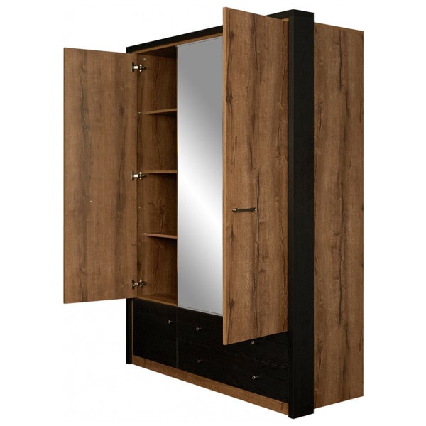 Шкаф JAGGER 3DG2S Z – это смелое и оригинальное решение для интерьера спальни в современном стиле. Контрастное сочетание текстур – дуб Монастырский и чёрный – добавляет элементу неординарный характер, а также один оттенок подчёркивает уникальность другого. Шкаф JAGGER 3DG2S Z имеет прямую конструкцию. Конструкция элемента представляет одно гардеробное отделение со штангой за двумя глухими дверями, одно отделение с полками за глухой дверью, два выдвижных ящика (2S). Двери распашные, крепятся на петли к боковому корпусу и внутренней перегородке. На средней двери (снаружи) крепится зеркало (Z). В изделии используется декоративная накладка в чёрном цвете.