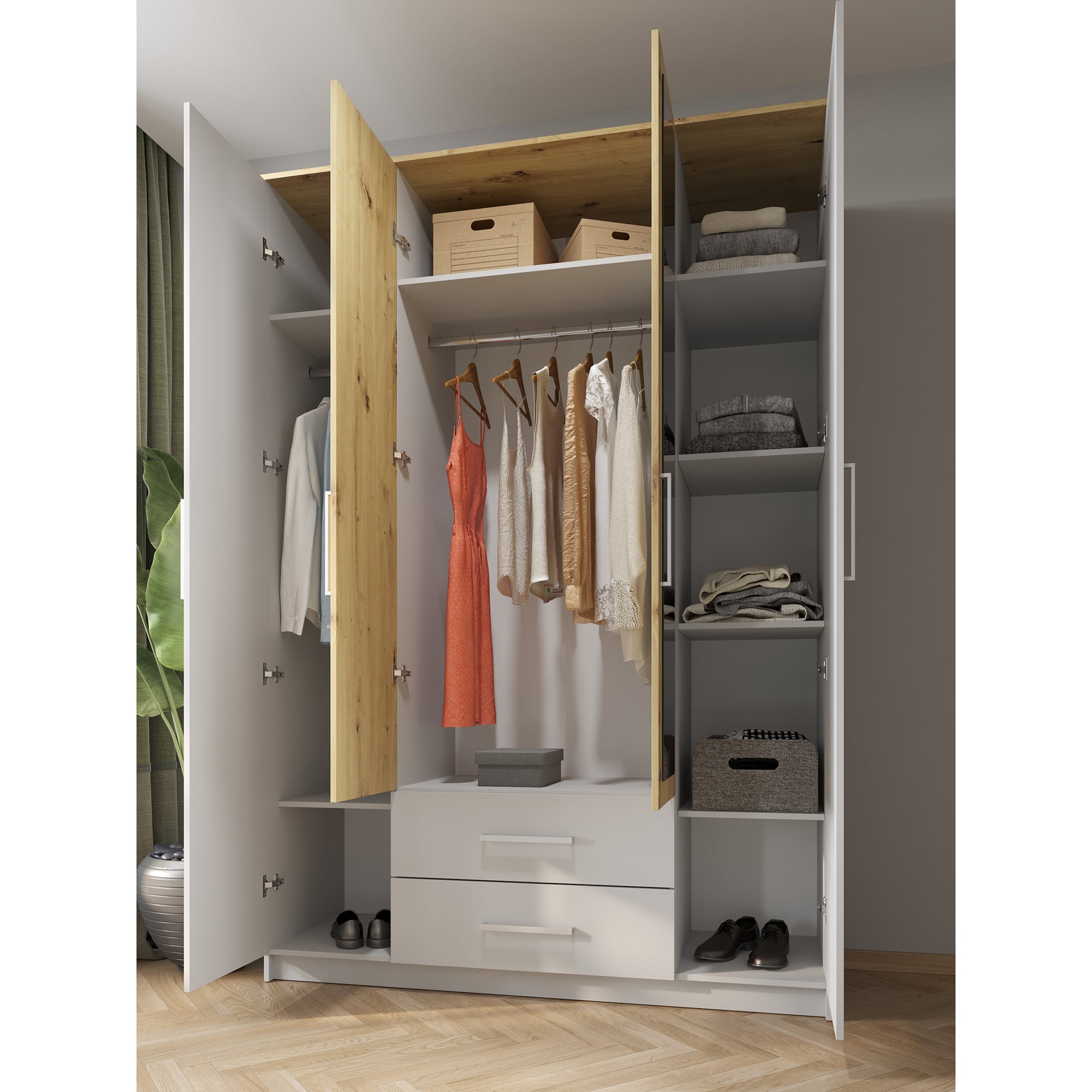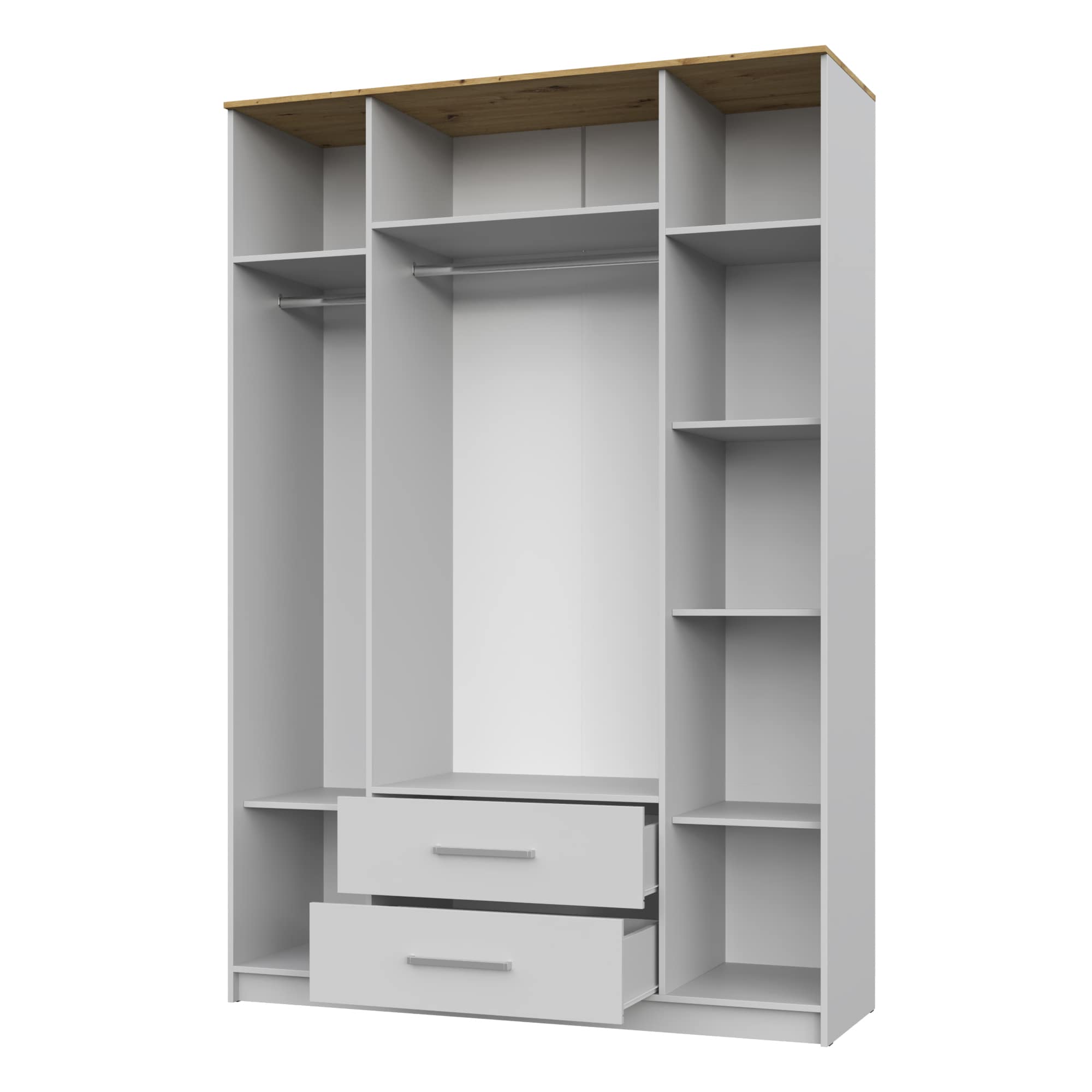 За боковой правой дверью шкафа находятся полки, которые подойдут для хранения сложенной одежды, нижнего и постельного белья, а также различных аксессуаров и коробок с обувью. Два выдвижных ящика обеспечивают дополнительное пространство для хранения.