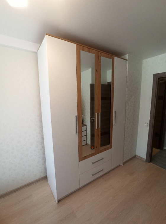 Шкаф оборудован четырьмя распашными дверями, за которыми находится широкая штанга для вешалок-плечиков. Это позволяет разместить большое количество одежды на вешалках, экономя пространство в шкафу.