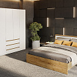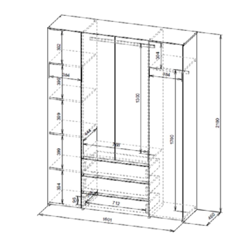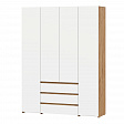Шкаф четырехстворчатый c распашными створками и с тремя выкатными ящиками на шариковых направляющих. Над ящиками центральный отсек для хранения со штангой. За левой створкой расположены четыре полки. За правой створкой расположена штанга металлическая и полка. Створка открывается при помощи толкателя. Фасады накладные.