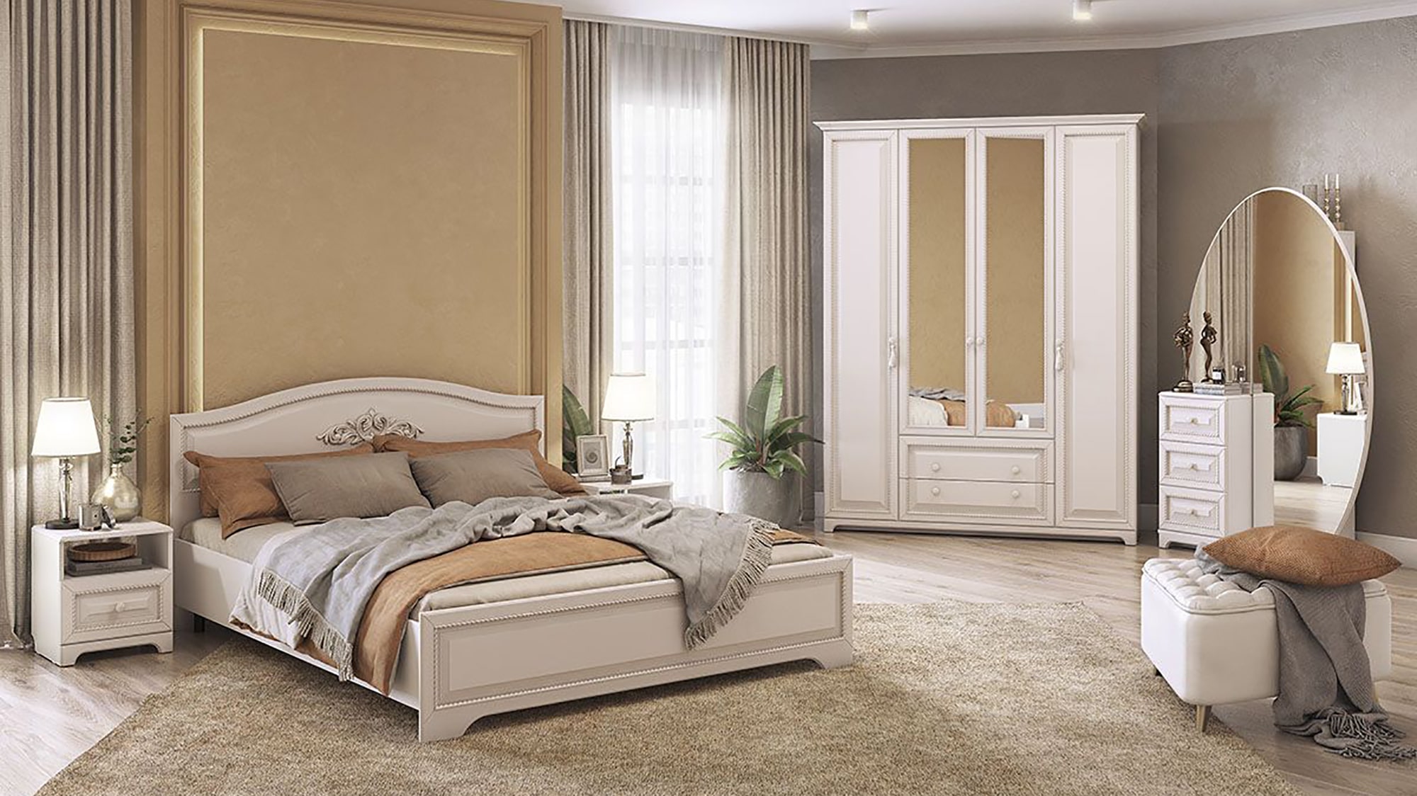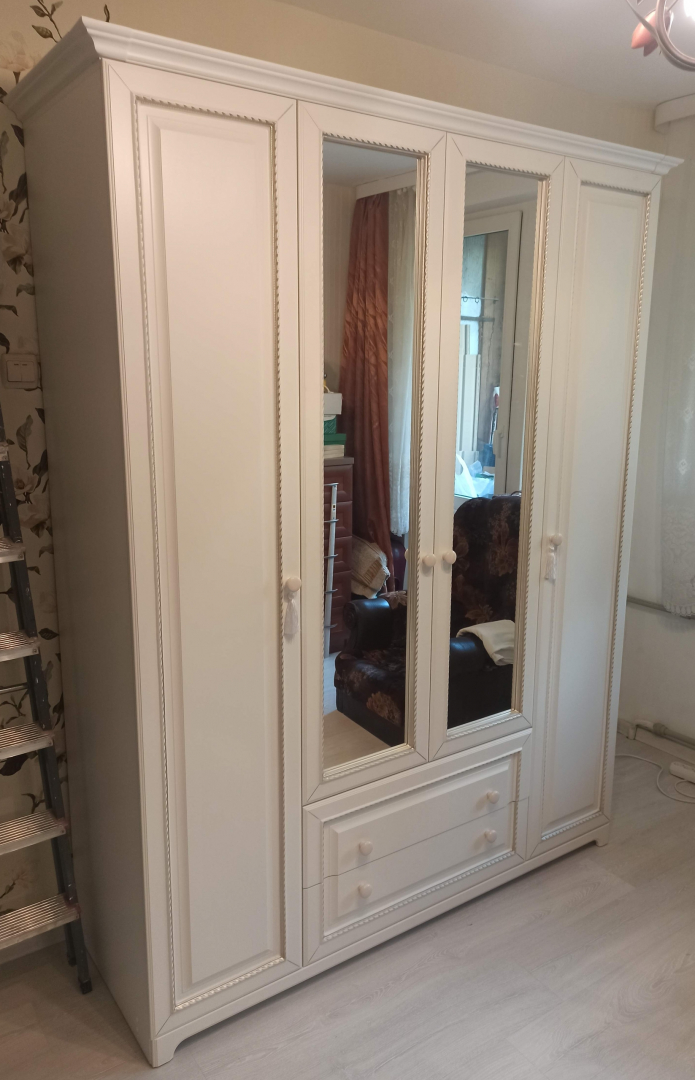 Нет ничего лучше, чем сочетание красоты и практичности. 4-створчатый шкаф «Белла» тому доказательство. Фасады шкафа выполнены в нежном оттенке джелато, дверцы украшены фрезеровкой, а ручки – декоративными кистями. Центральный отсек шкафа оснащен круглой штангой для одежды, а боковые – полками. Выдвижные ящики прекрасно подойдут для хранения вещей.