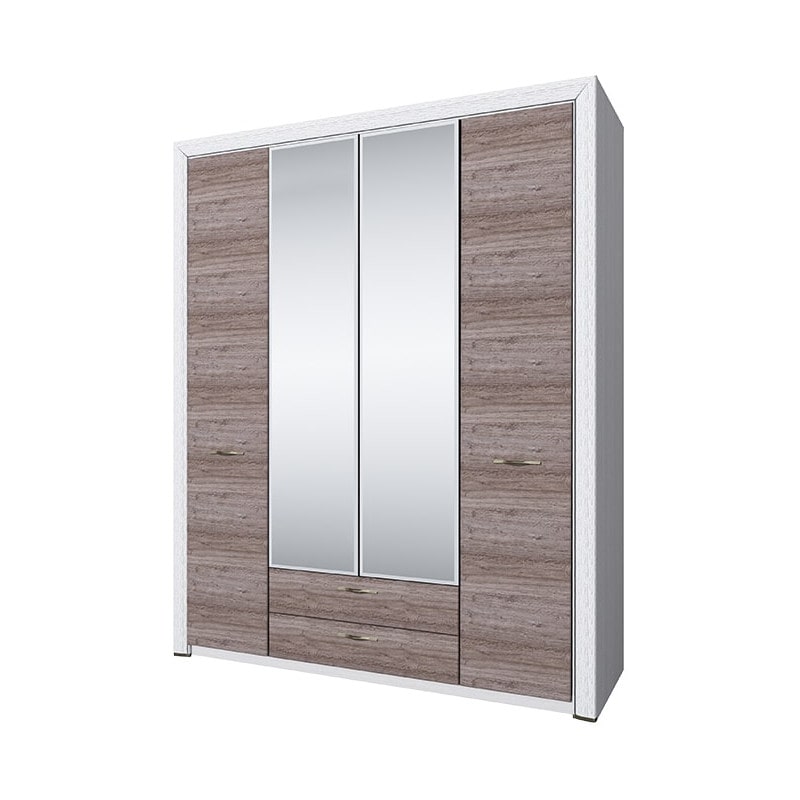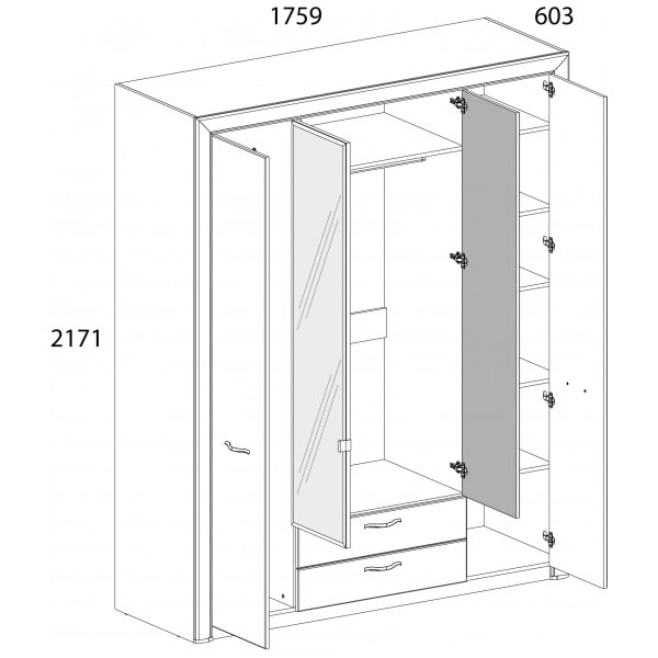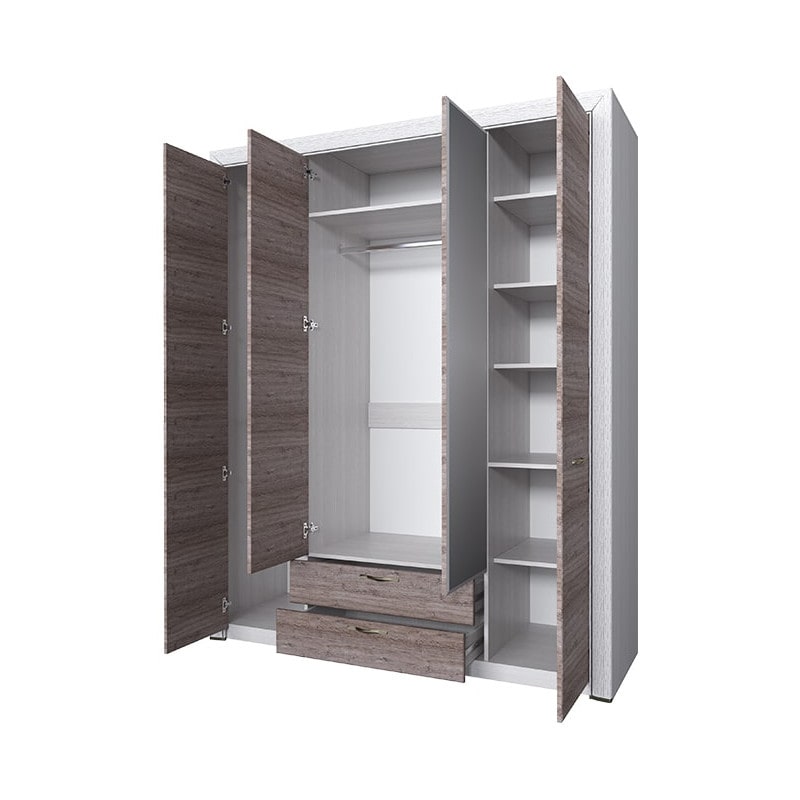 Функциональный и вместительный шкаф 4D2S коллекции Оливия для спальни. Является не только одним из главных предметов любой спальни, но и практичным хранителем одежды, белья и других предметов. Имеет четыре двери (4D), дополнительную комодную секцию – два выдвижных ящика (2S). Шкаф Оливия 4D2S прямой, дверцы распашные, крепятся на петлях к боковым и внутренним перегородкам. Одно отделение для одежды с двумя штангами, одно отделение для одежды с одной штангой, отделение с глубокими полками для белья и других предметов одежды. Сверху расположена глубокая и вместительная ниша для хранения головных уборов.