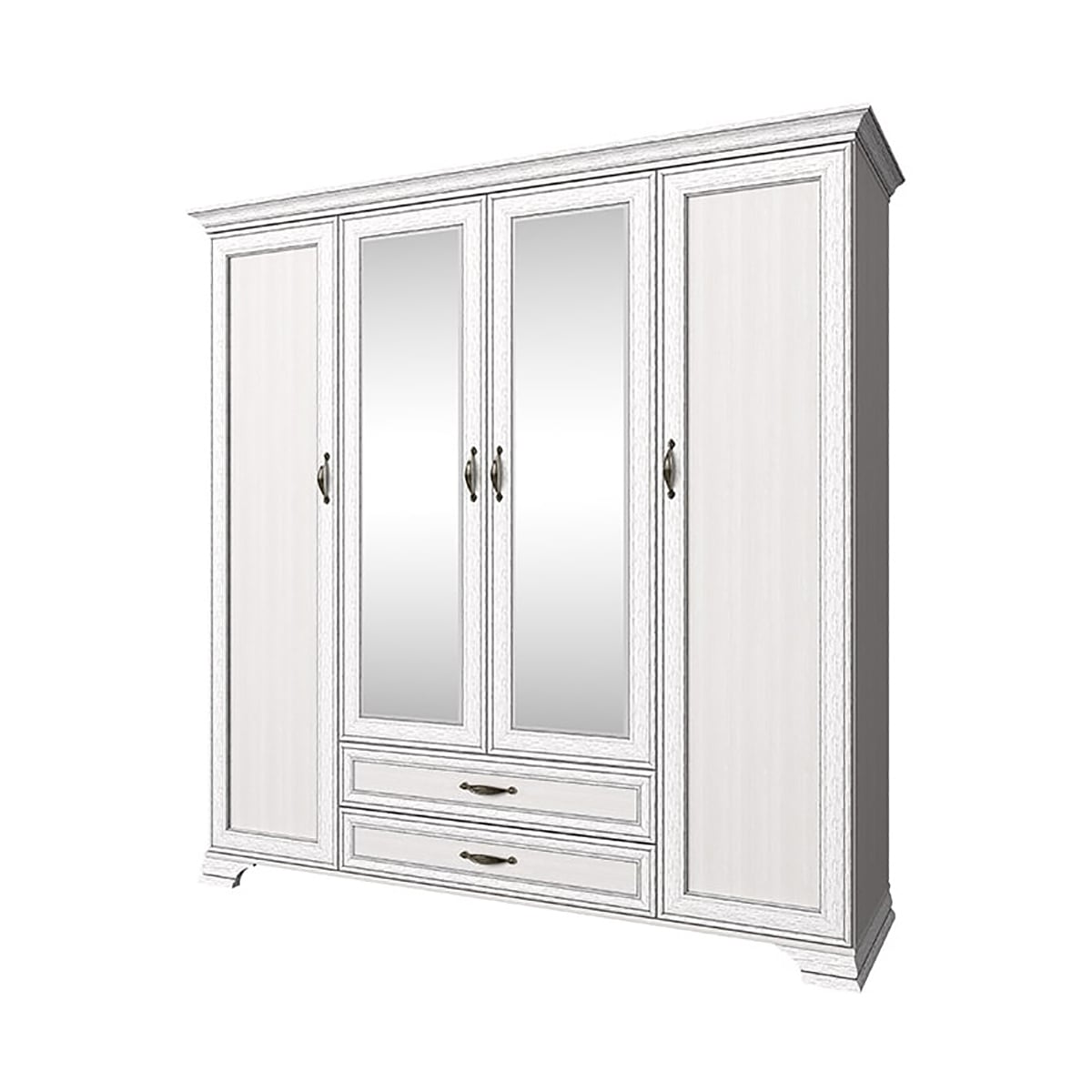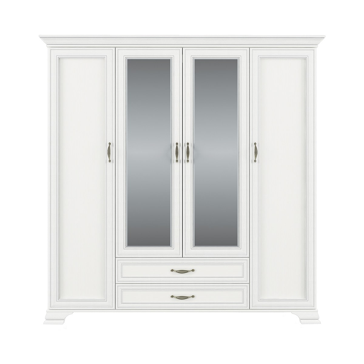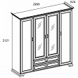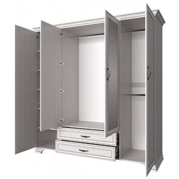 Шкаф Тиффани 4D2S – не только элегантный и роскошный элемент спальни, но и удобный функциональный предмет мебели в интерьере. Шкаф 4D2S имеет четыре двери (4D), дополнительную комодную секцию – два выдвижных ящика (2S). Шкаф Тиффани 4D2S прямой. Конструкция элемента представляет собой одно гардеробное отделение с двумя штангами за глухой дверью, одно (большое) гардеробное отделение с одной штангой для предметов верхней одежды и других вещей за глухими дверями (снаружи закреплены зеркала), отделение с глубокими полками для хранения белья и других вещей за глухой дверью. Дверцы распашные, крепятся на петли к боковому корпусу и внутренним перегородкам.