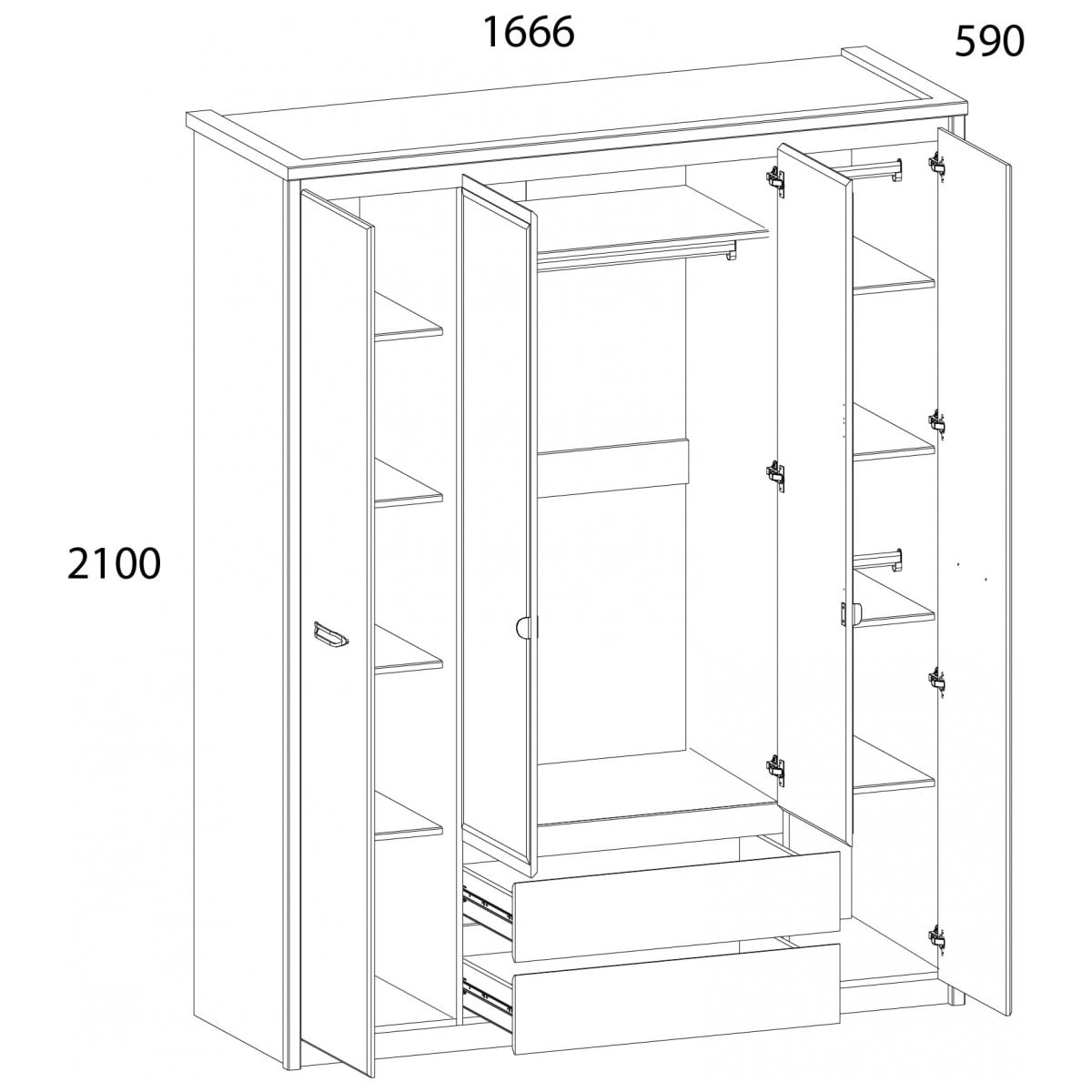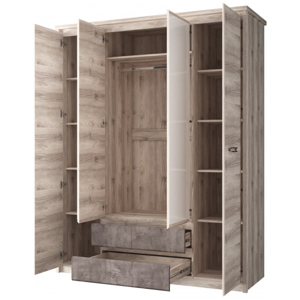 Удобный и функциональный предмет мебели для оформления интерьера спальни. Организует компактное хранение белья, предметов одежды и других вещей. Шкаф 4DG1S имеет прямую конструкцию. Конструкция элемента представляет собой одно гардеробное отделение со стационарной штангой и вместительной нишей сверху за двумя глухими дверями, два отделения с полками ЛДСП за глухими фасадами, один выдвижной ящик (1S). Двери распашные, крепятся на петли к боковому корпусу изделия и внутренним перегородкам.
