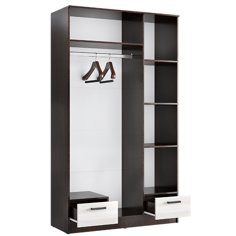 Три распашные двери шкафа обеспечивают удобное размещение предметов гардероба, а внутри шкафа находятся четыре полки и два ящика для дополнительного пространства хранения.