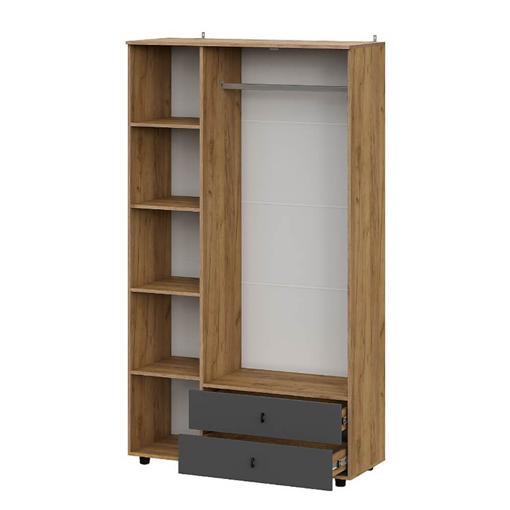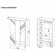 Створки и накладки из МДФ с фрезеровкой в пленке ПВХ. В левой части шкафа расположен отсек с четырьмя полками (одна стационарная и три съемных), в правой части шкафа расположен отсек со штангой (присадка под штангу отсутствует, покупатель устанавливает ее самостоятельно), под которым установлены два выкатных ящика.
