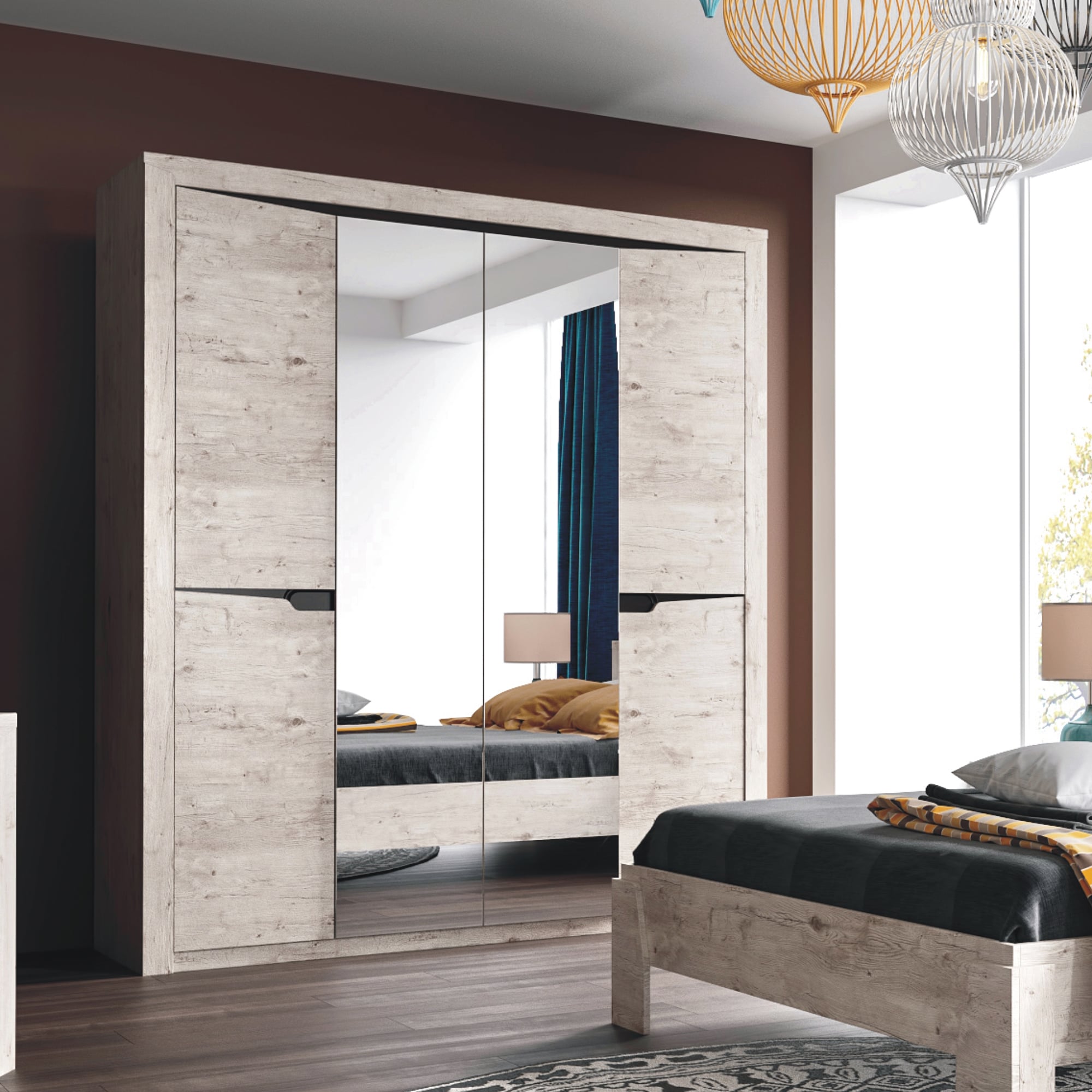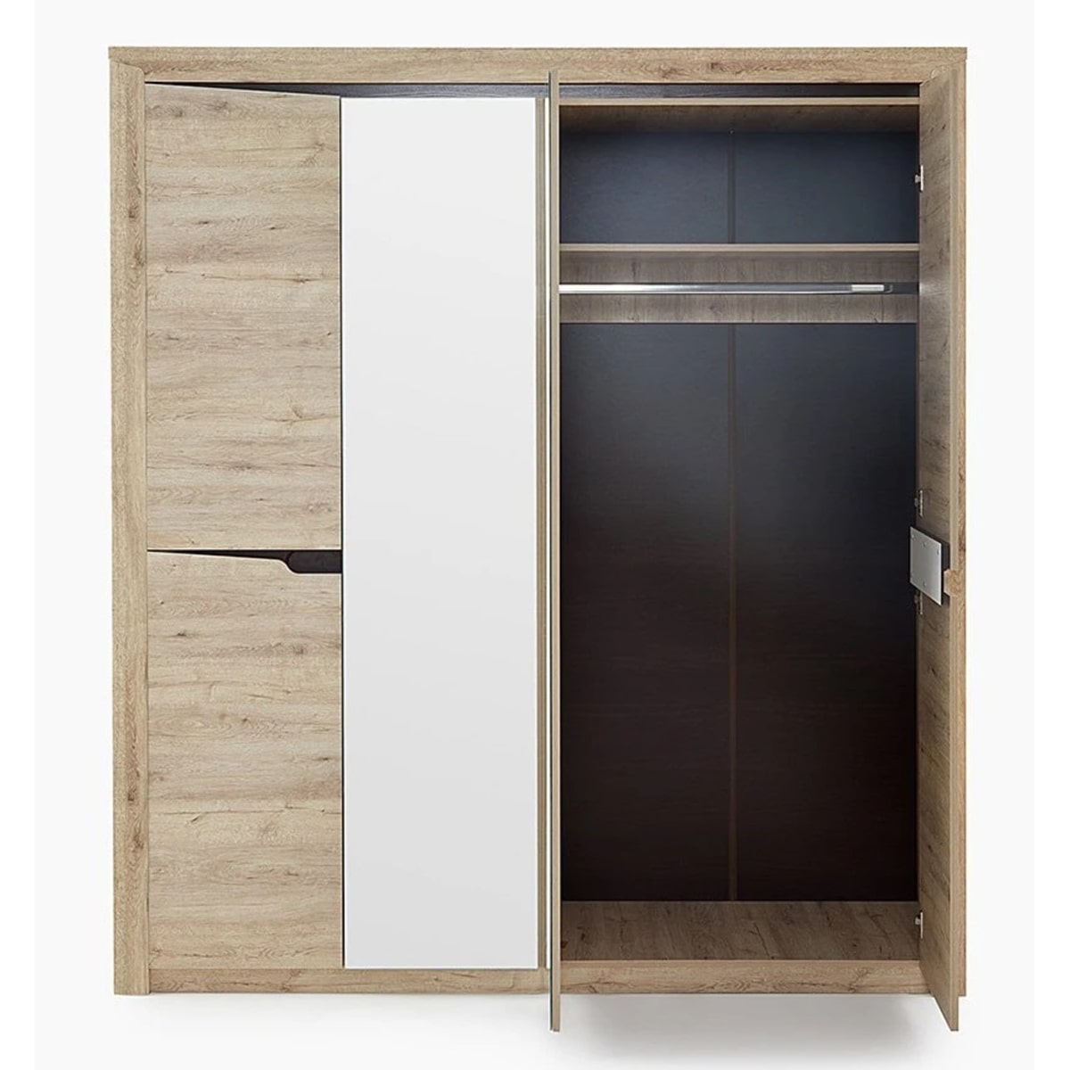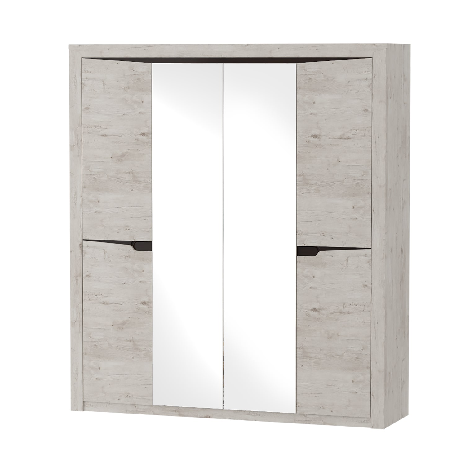 Четырёхдверный шкаф "Соренто" с зеркалом отлично подойдёт для спальни или прихожей и станет прекрасным дополнением к вашему интерьеру. На боковых дверях имеются декоративные вырезы, выполняющие функцию ручек. Одно из отделений шкафа можно изменить комплектом из трёх полок (приобретается отдельно).