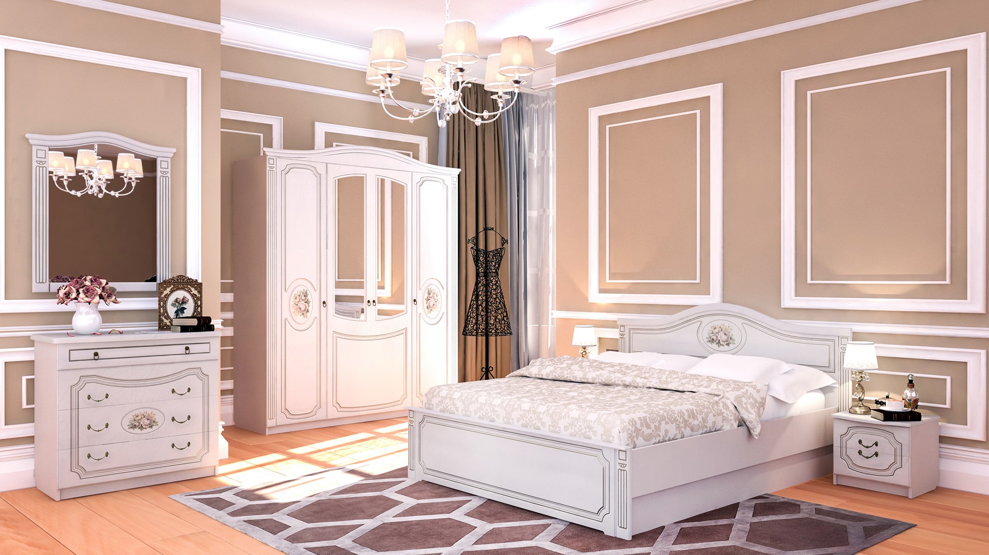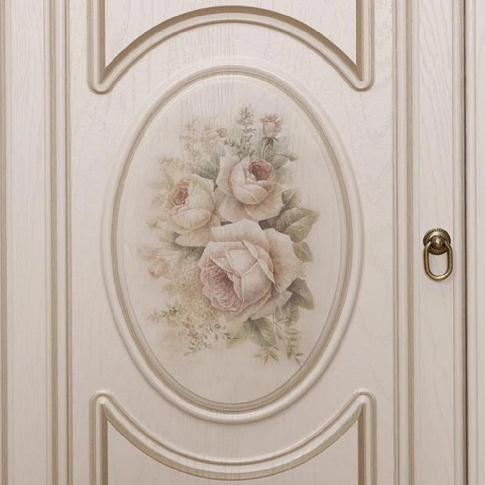 Фасады мебели декорированы элегантной фрезеровкой с эффектом патины и медальоном, на котором изображены розы. Для удобства использования дверцы и ящики оснащены темными металлическими ручками, имитирующими ковку.
