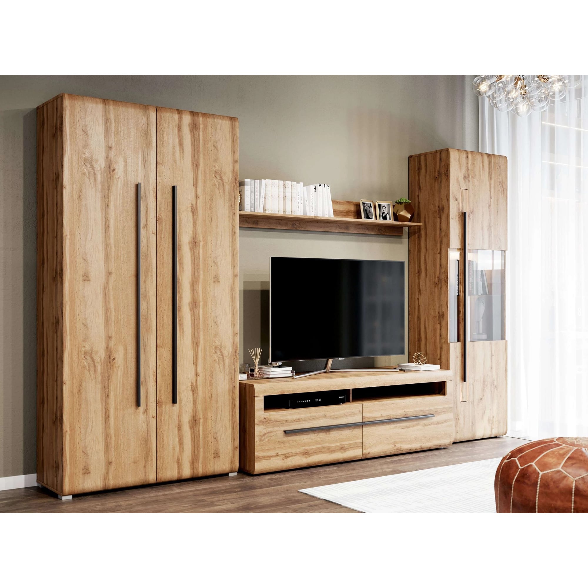 Корпус шкафа изготовлен из ЛДСП, фасады с закругленными линиями - из МДФ. Стиль изделия подчеркивают черные металлические ручки. Внутреннее пространство шкафа разделено на верхнюю широкую полку по горизонтали и на два отделения по вертикали: платяное и для хранения вещей. В платяном отделении находится одна поперечная штанга и одна стационарная полка. В отделении для хранения вещей установлено четыре съёмные полки.