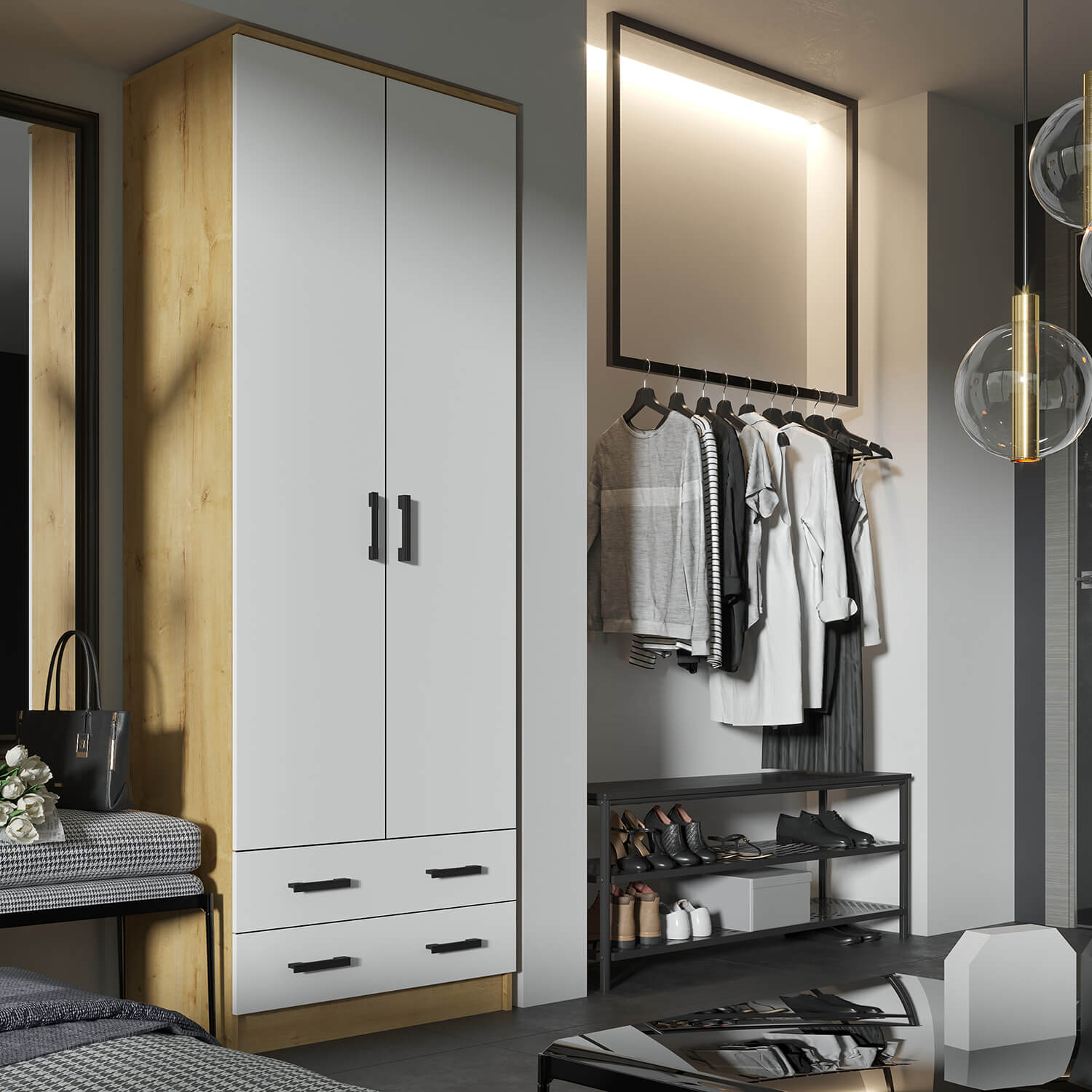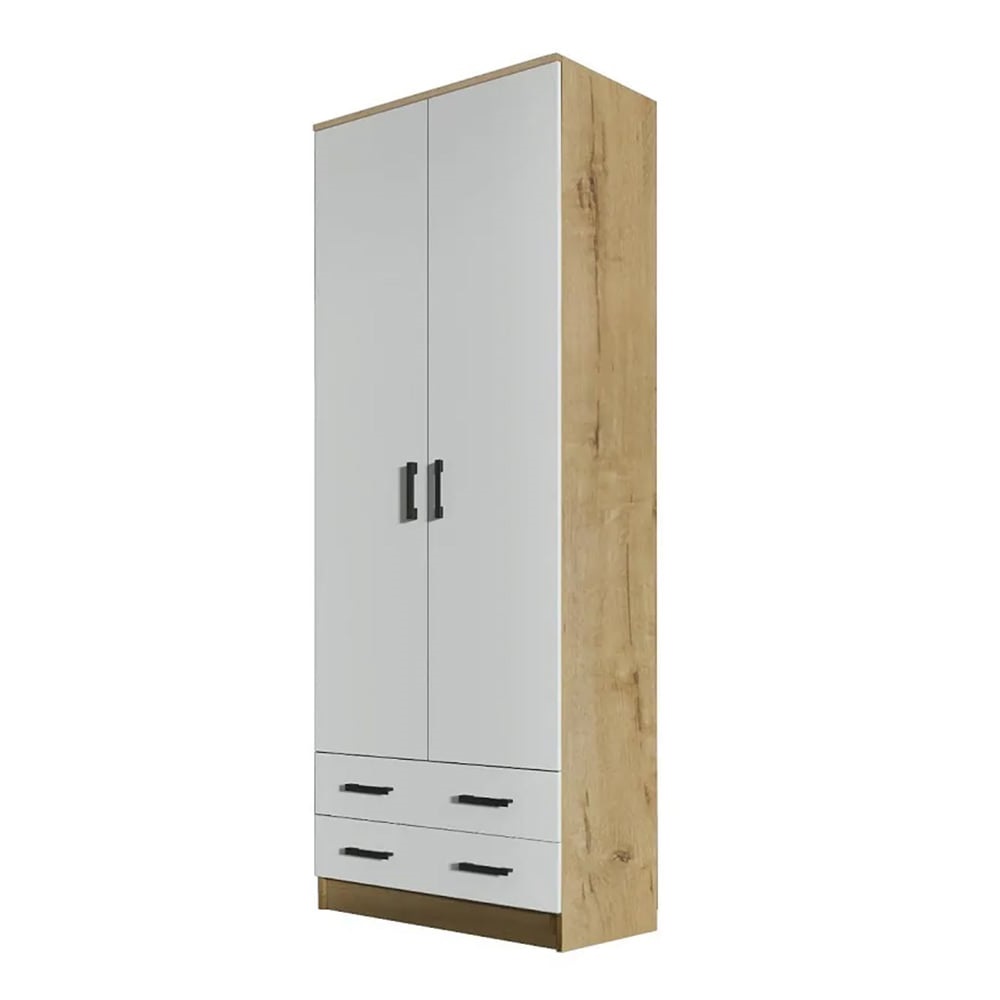 Шкаф оснащен двумя распашными дверями, что обеспечивает удобный доступ к содержимому. Внутри шкафа расположена штанга для вешалок, а также два выдвижных ящика для мелочей.