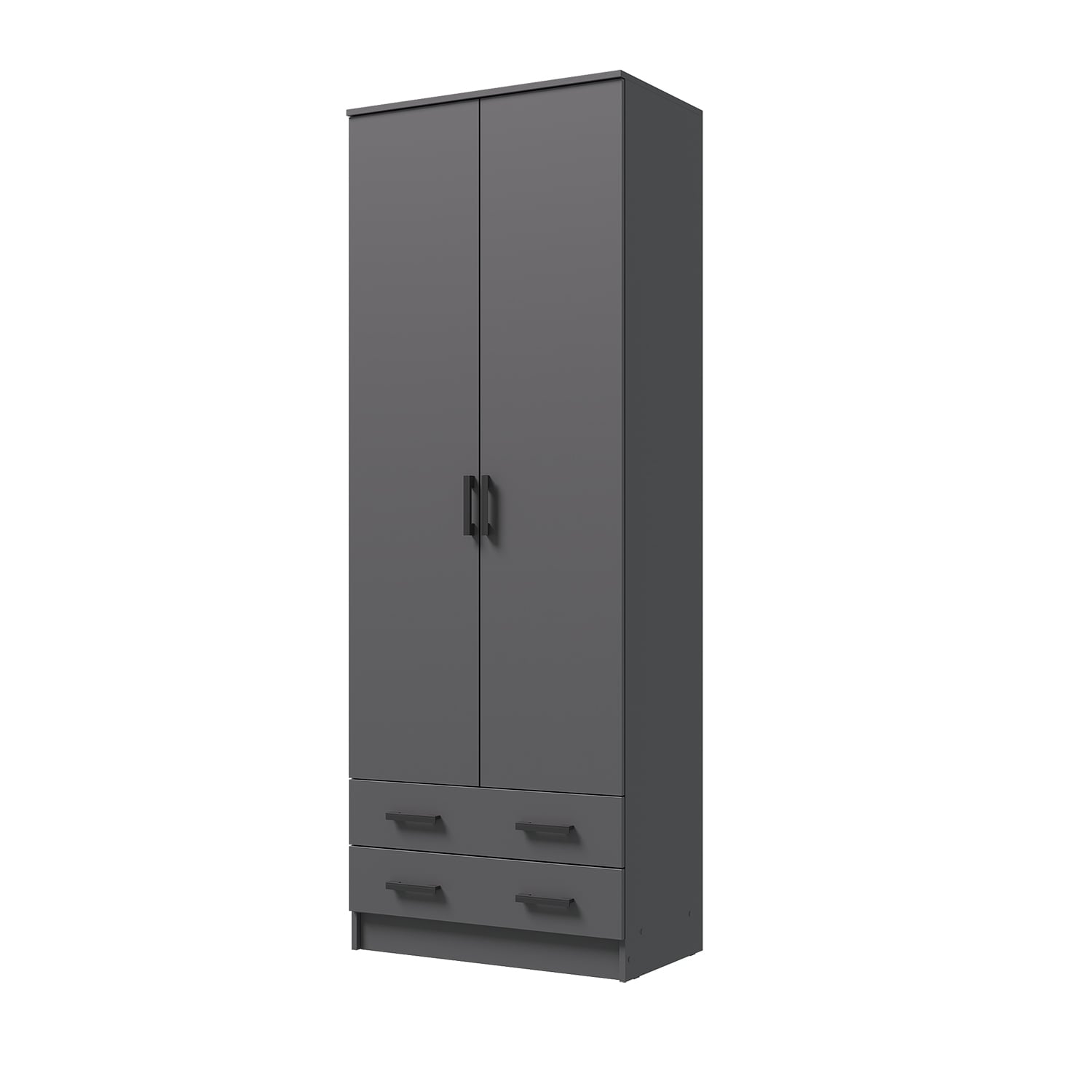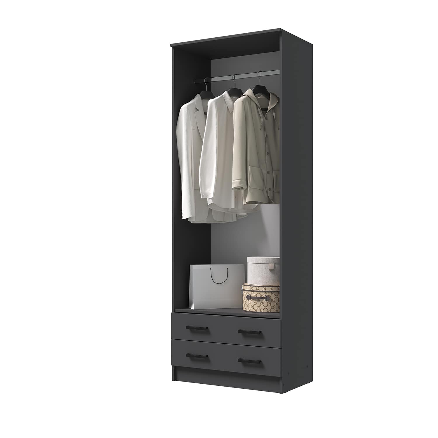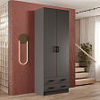 Шкаф оснащен двумя распашными дверями, что обеспечивает удобный доступ к содержимому. Внутри шкафа расположена штанга для вешалок, а также два выдвижных ящика для мелочей.