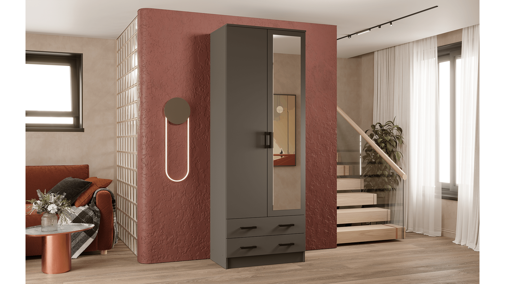 Шкаф Эра Дуэт выполнен в стиле модерн, что позволяет ему гармонично вписаться в любой интерьер - будь то детская, гостиная, прихожая или спальня. Цвет графит придает шкафу изысканный и современный вид.