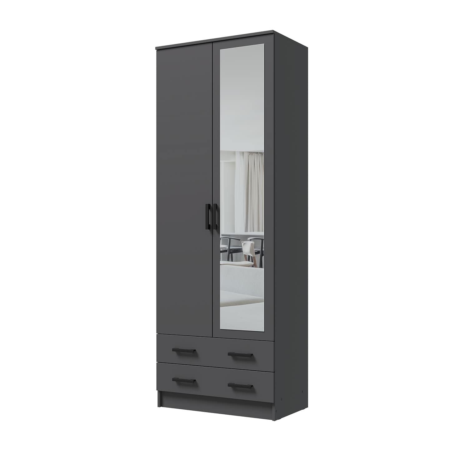 Шкаф оснащен двумя распашными дверями, за которыми находятся три полки и штанга. Это позволяет удобно разместить одежду, аксессуары и другие предметы, экономя пространство в комнате.