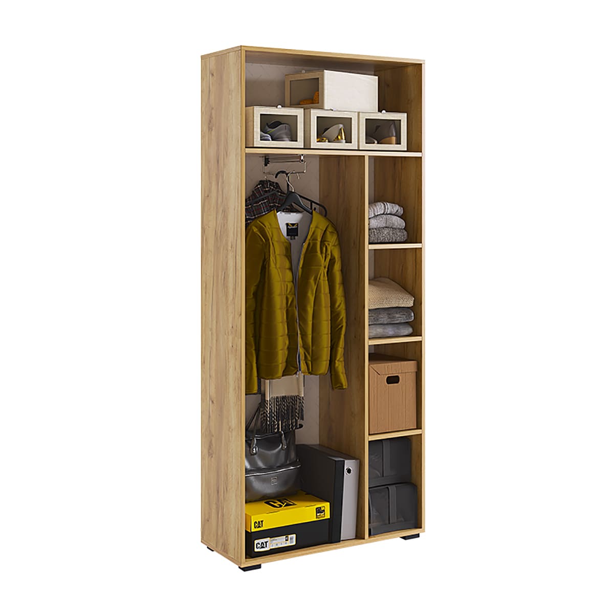 Шкаф оснащен двумя распашными дверями, что обеспечивает удобный доступ к содержимому. Внутри шкафа предусмотрено 6 секций, включая выдвижную штангу для вешалок и 4 полки. Это позволяет разместить все необходимые вещи и аксессуары.