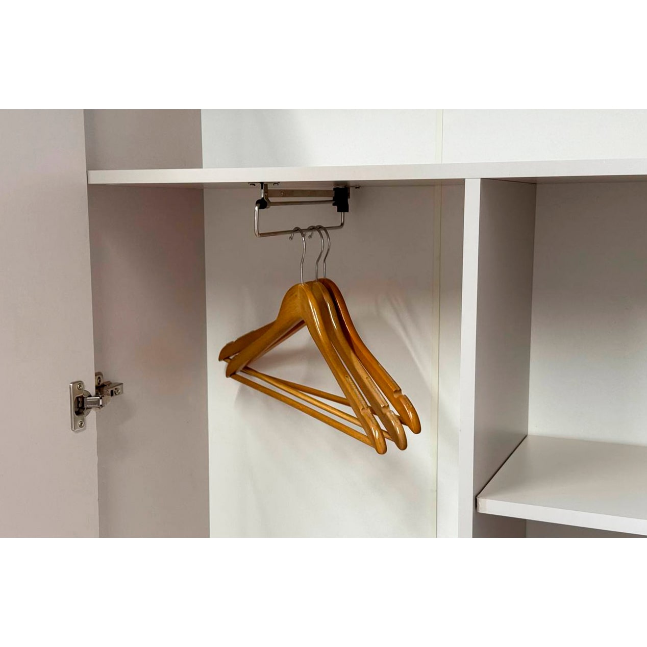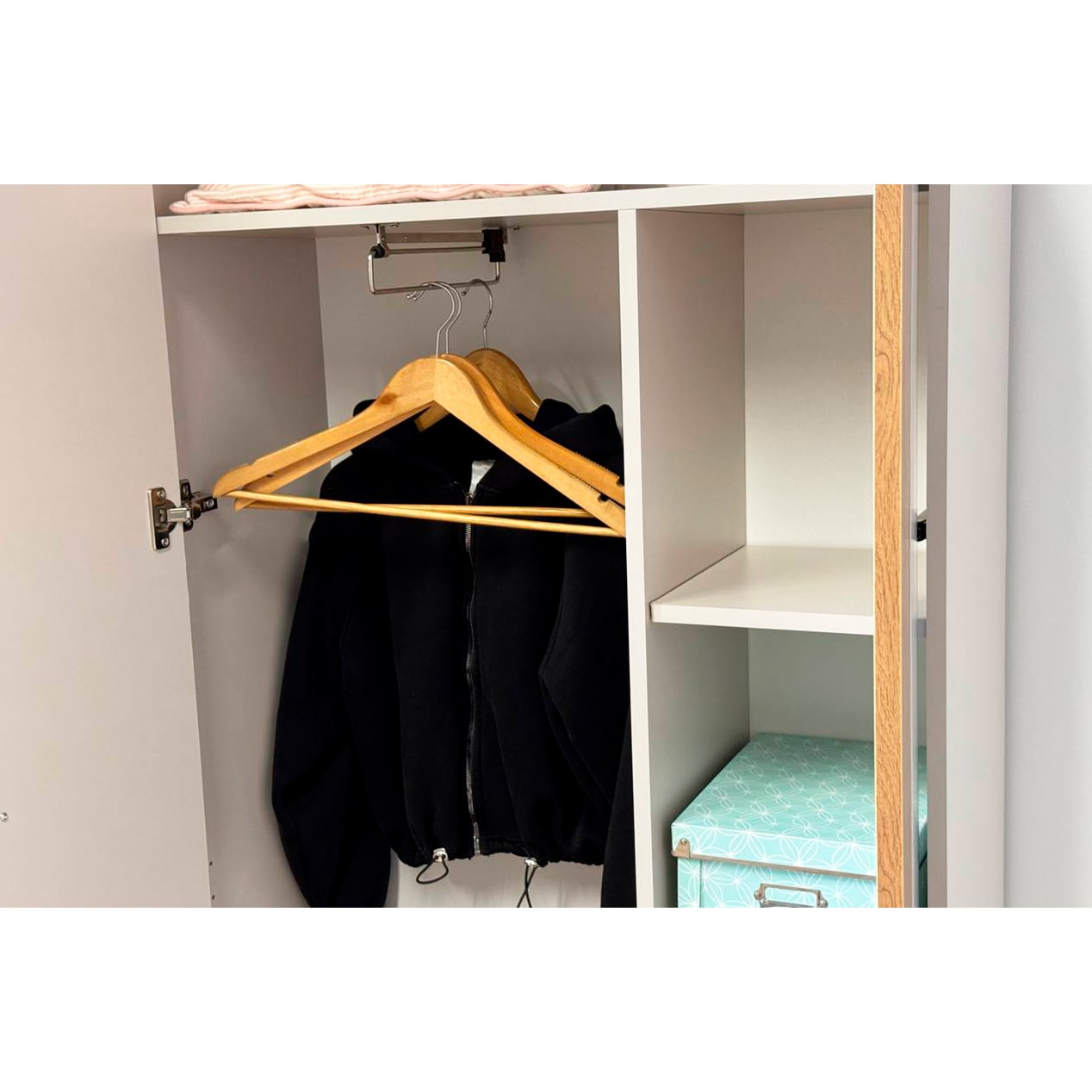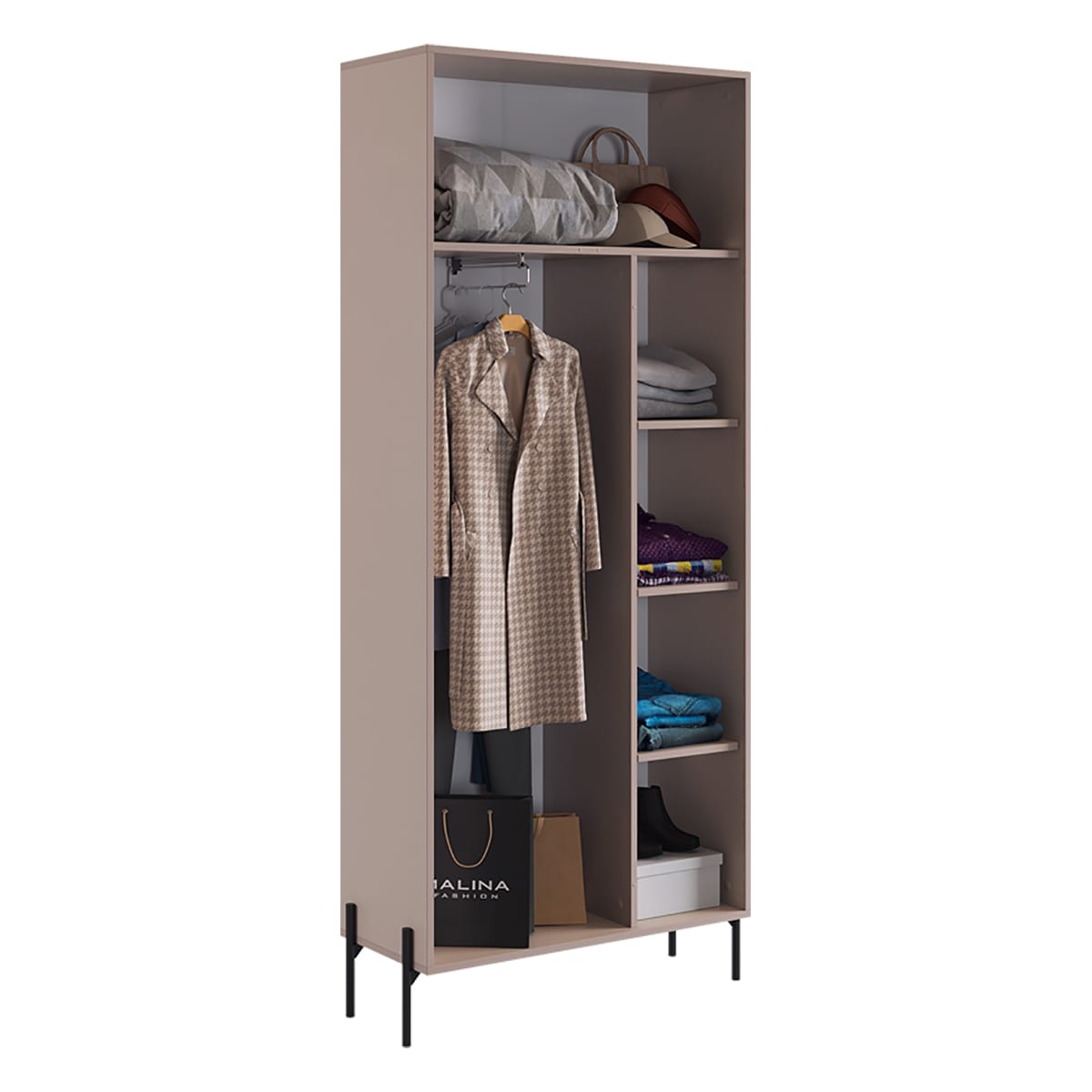 Шкаф "Доминика" оснащен глухими фасадами, скрывающими за собой просторное внутреннее пространство. На одной стороне шкафа находится штанга для одежды, обеспечивая удобное место для хранения одежды на вешалках.