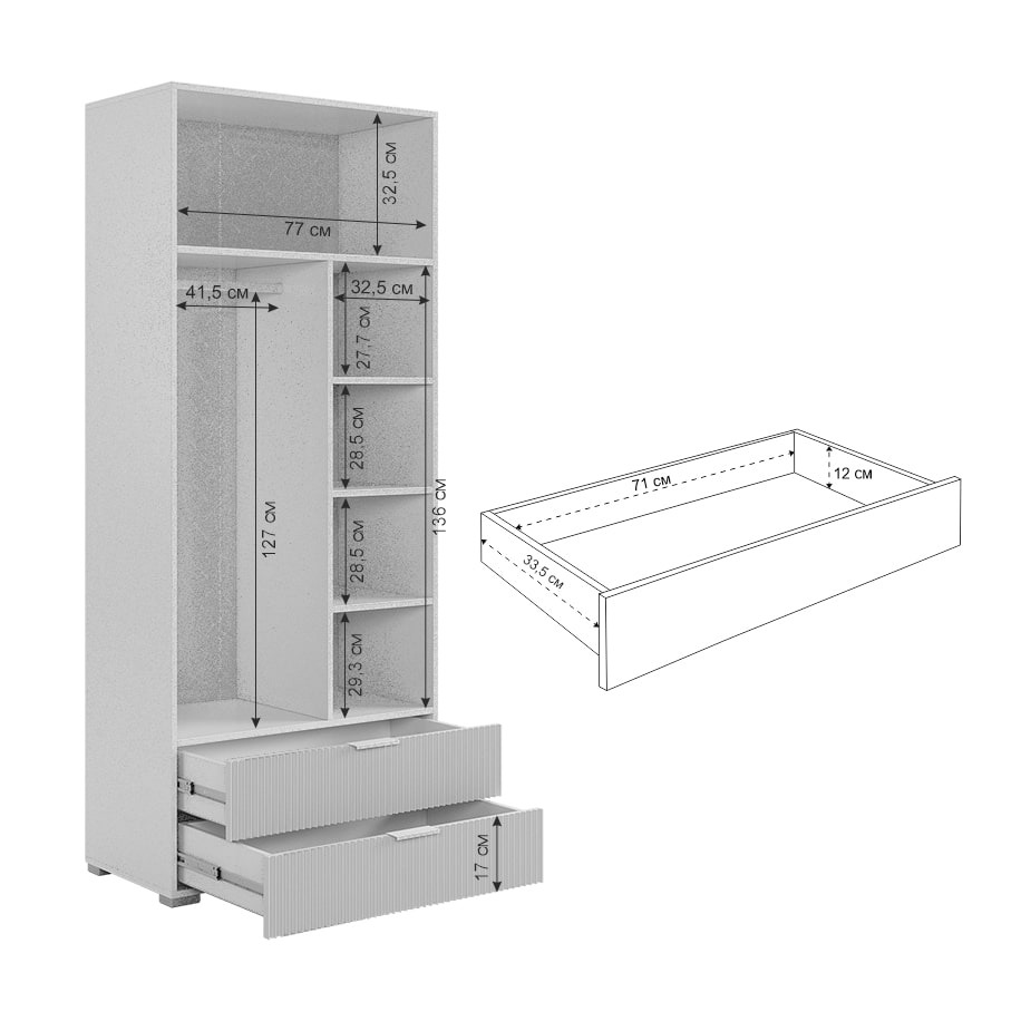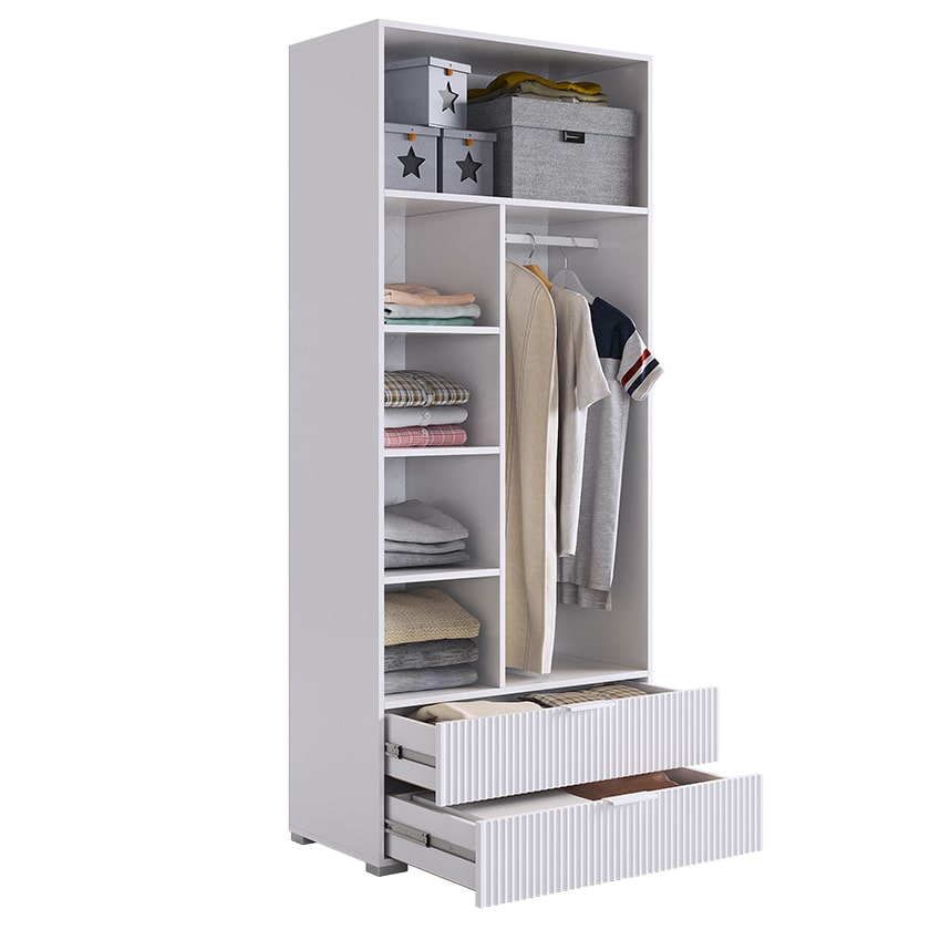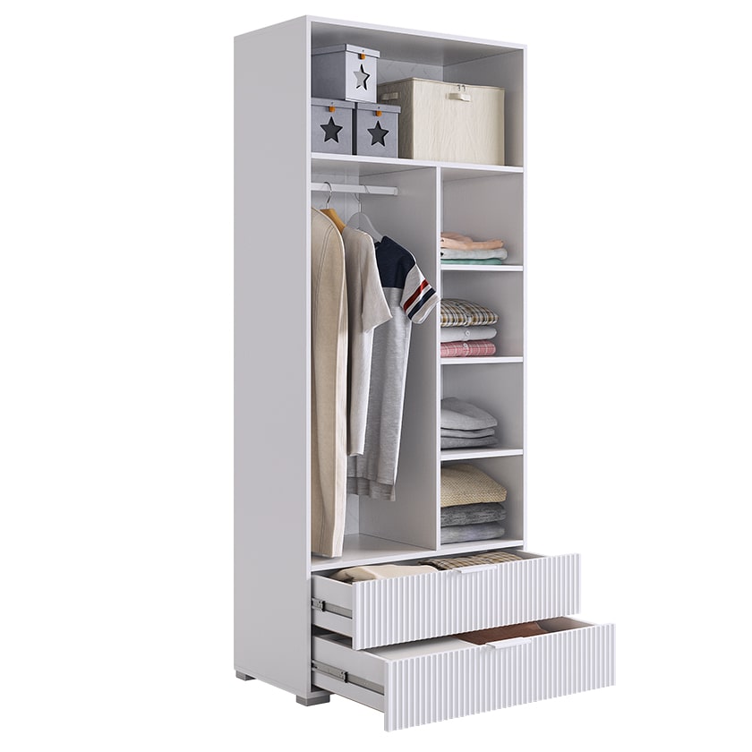 Удобное и практичное наполнение шкафа включает одну общую верхнюю полку и секцию со штангой для одежды, а также дополнительные полки. Это позволяет разделить пространство так, чтобы все предметы были удобно и компактно размещены.