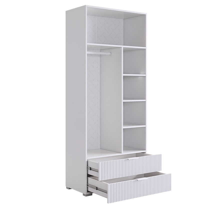 Шкаф изготовлен из ЛДСП в белом цвете, что придаст помещению светлую и уютную атмосферу. Фасады распашных дверей выполнены из ЛДСП в цвете белое дерево. Фасады выкатных ящиков выполнены из МДФ, покрытие эмаль. Вертикальные полосы на фасаде создают особую изысканность и стильный акцент, добавляя глубины пространству.