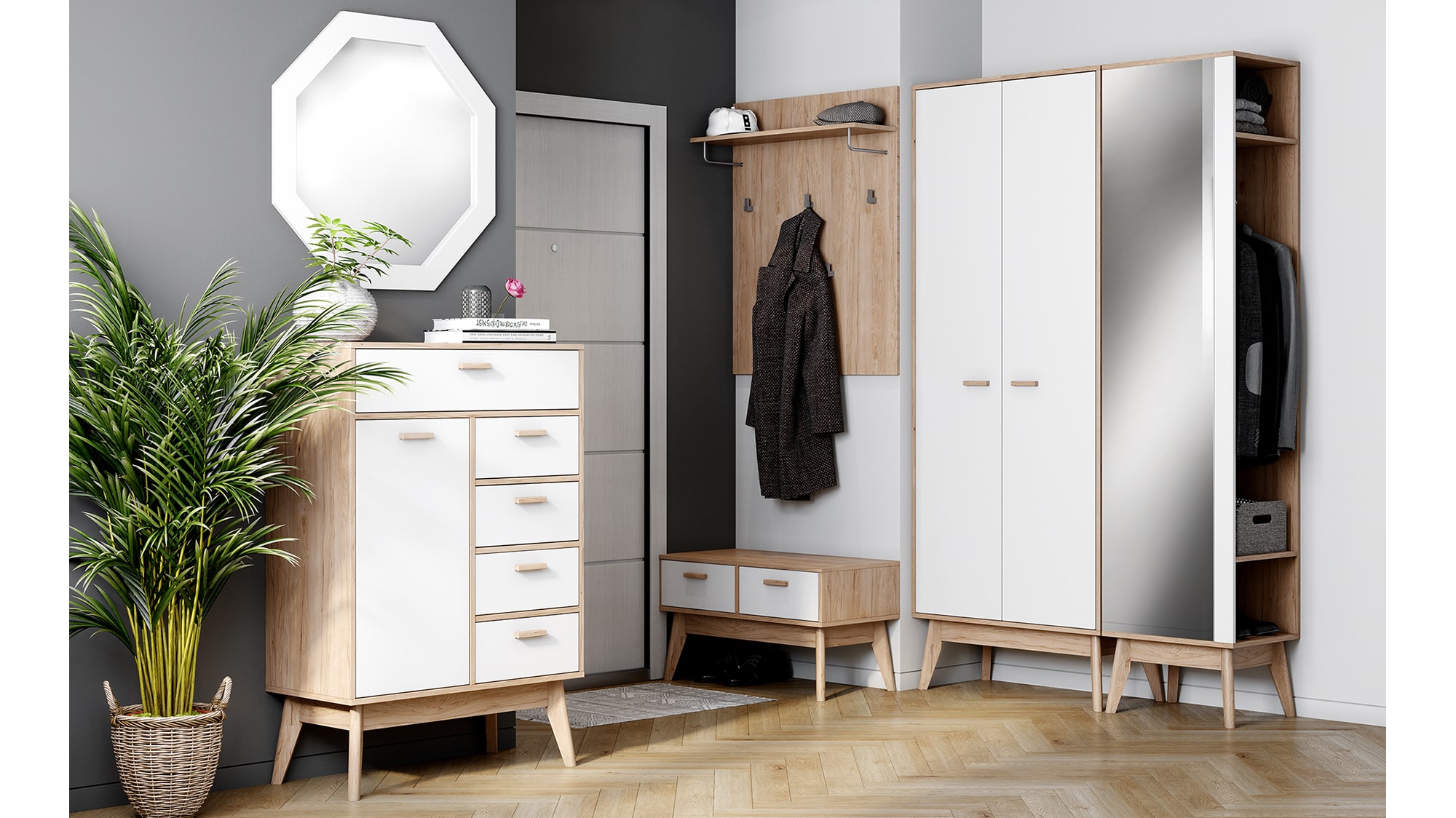 Шкаф "Калгари" для прихожей - это высокий, достаточно узкий и в то же время вместительный гардероб с выдвижной штангой для одежды на плечиках, белоснежными дверцами из МДФ и корпусом из ЛДСП цвета натурального дуба, который хорошо впишется в вашу прихожую, выполненный в модном скандинавском стиле.