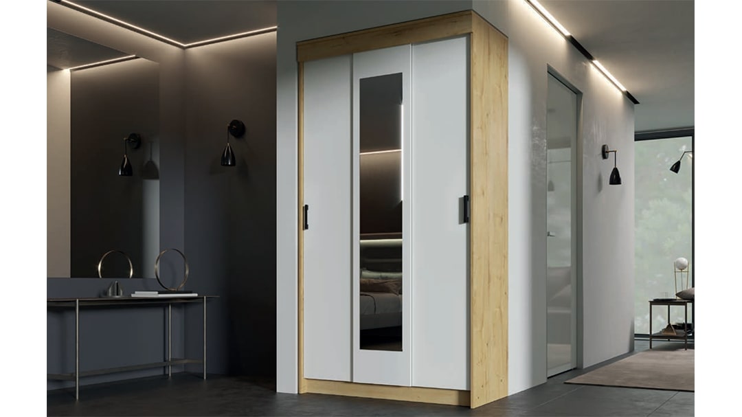 Функциональность: шкаф-купе оснащен тремя раздвижными дверями, пятью полками и штангой для вешалок. В нем можно разместить большое количество одежды и аксессуаров.