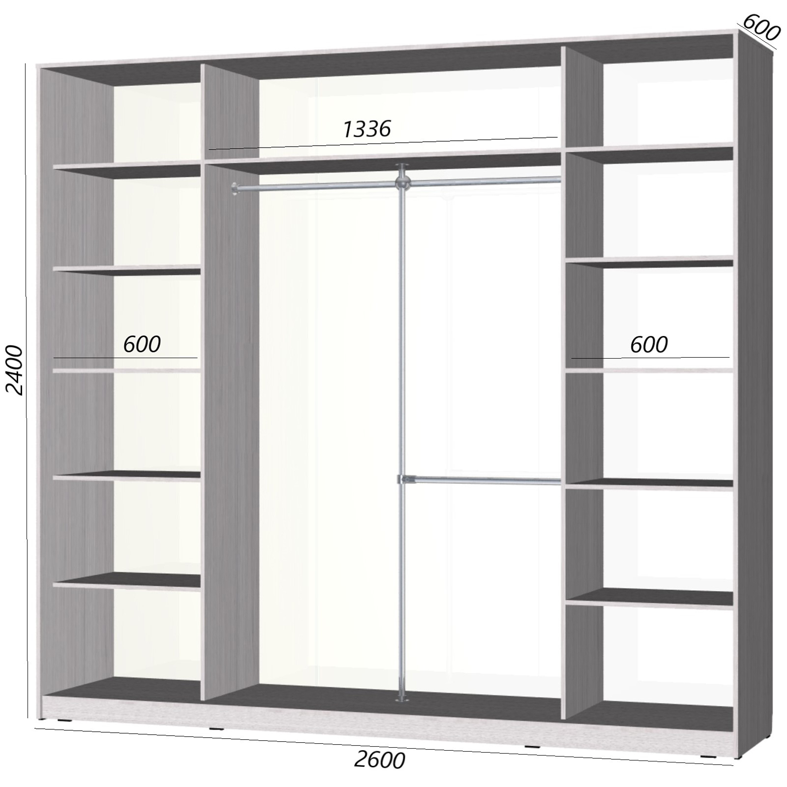 Длина шкафа почти 2,6 метра, благодаря этому отделение для хранения одежды на вешалках имеет 3 секции. В нем установлены штанги, поэтому Вам больше не нужно долго искать нужную вещь.