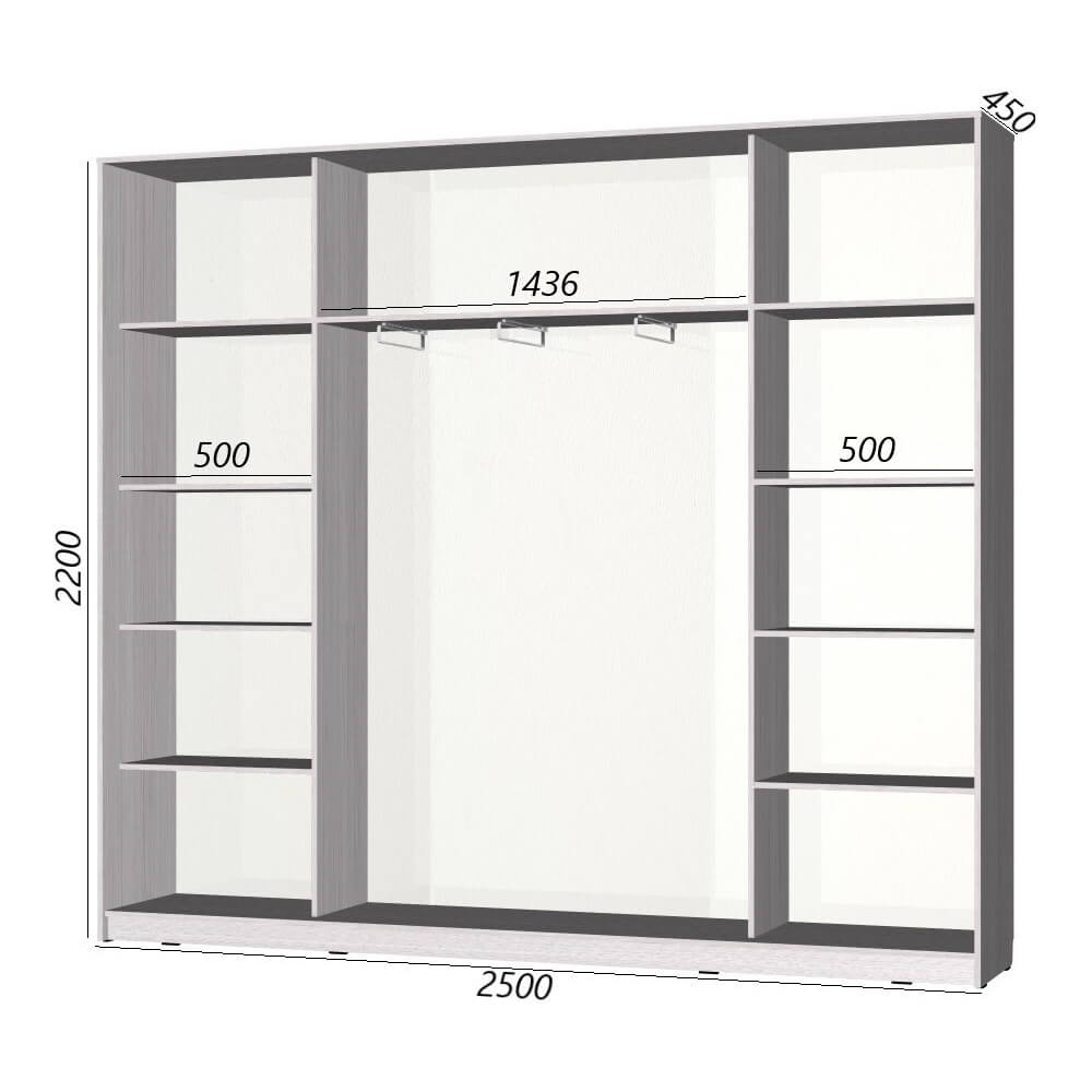 Шкаф-купе серии «Старт» 2500 - подойдет даже самой активной моднице, или же семейству из нескольких человек. Его длина 2,5 метра! Благодаря продуманной конструкции внутреннего наполнения сюда поместиться больше по сравнению с аналогичными конструкциями.
