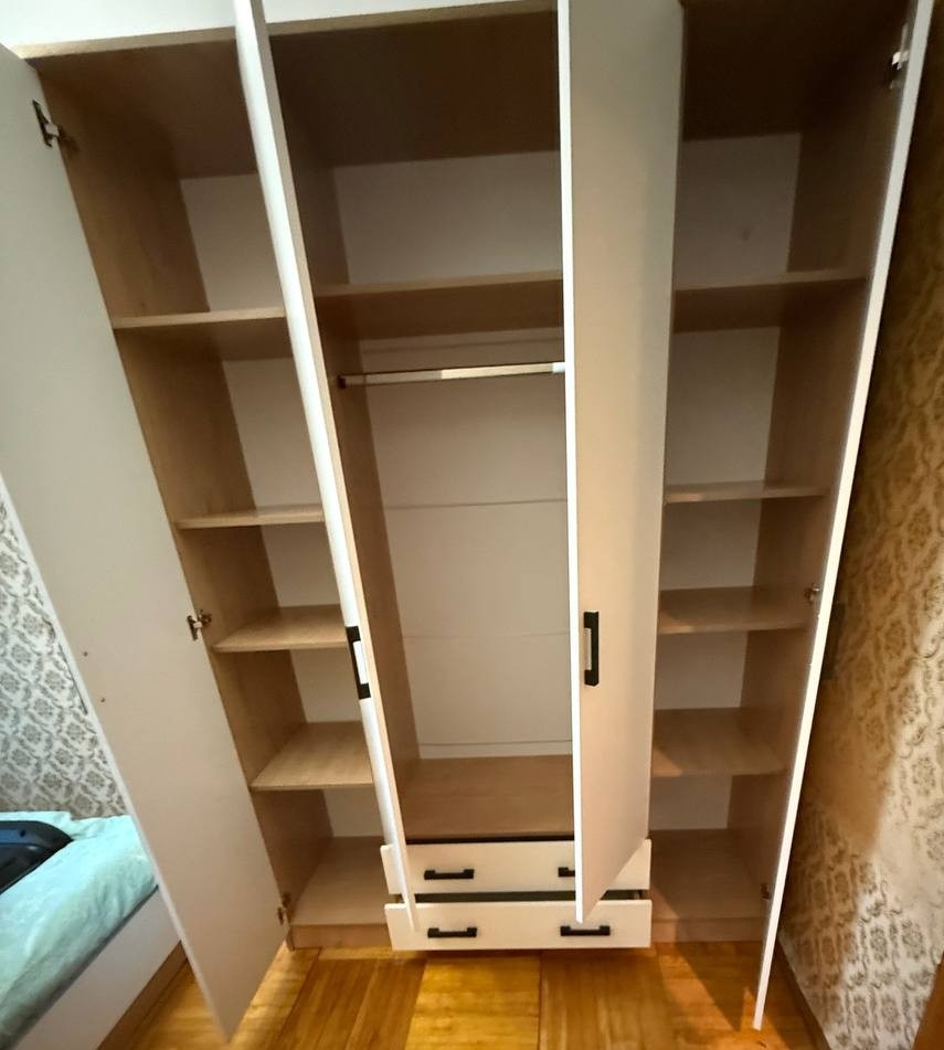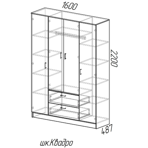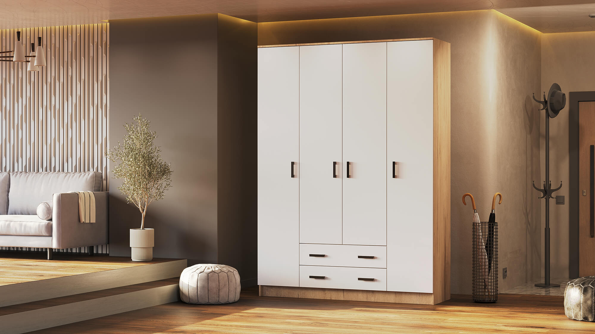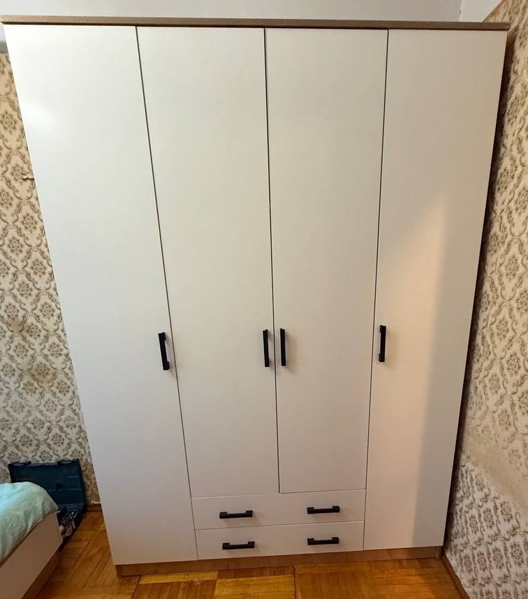 Шкаф оснащен четырьмя распашными дверями, штангой для вешалок. Это обеспечивает удобный доступ к вещам.