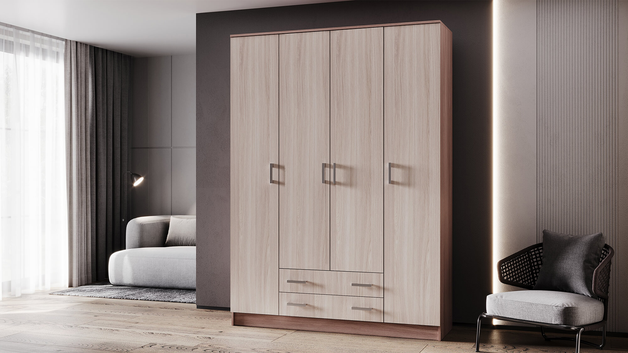 Шкаф оснащен четырьмя распашными дверями, что обеспечивает удобный доступ к содержимому. Внутри шкафа расположены девять полок, а также две секции с ящиками для хранения мелких предметов.