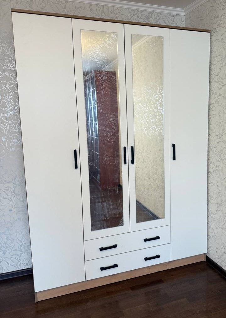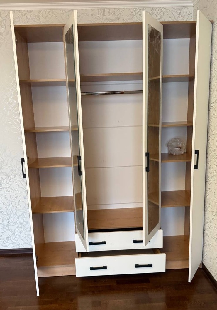 Шкаф оснащен четырьмя распашными дверями, штангой для вешалок и двумя зеркалами. Это обеспечивает удобный доступ к вещам и позволяет видеть себя в полный рост.