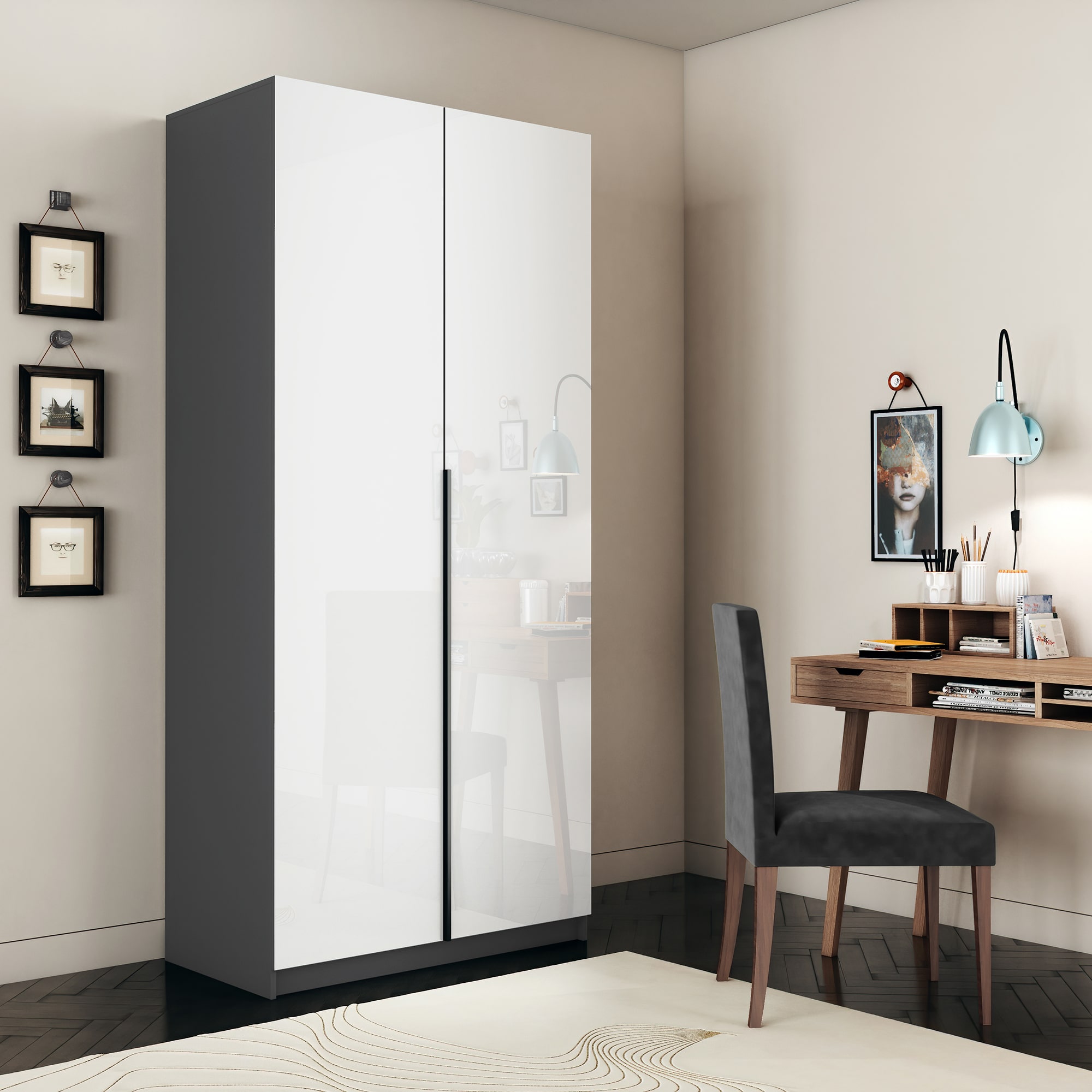 Шкаф оснащен долговечной, ударостойкой кромкой ПВХ, которая защищает его торцы от сколов и повреждений. Мебельные петли Titus B-Type обеспечивают открывание и закрывание двери под углом 110 градусов, а также предотвращают ее перекос. Шкаф оснащен удобной минималистичной ручкой, изготовленной из алюминия.