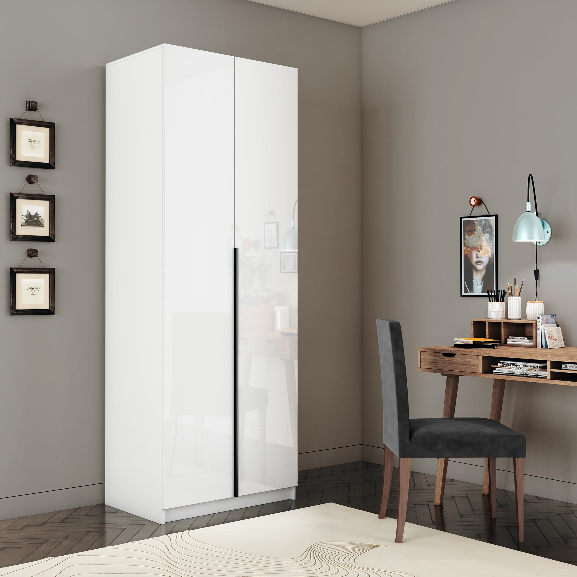 Шкаф оснащен долговечной, ударостойкой кромкой ПВХ, которая защищает его торцы от сколов и повреждений. Мебельные петли Titus B-Type обеспечивают открывание и закрывание двери под углом 110 градусов, а также предотвращают ее перекос. Шкаф оснащен удобной минималистичной ручкой, изготовленной из алюминия.