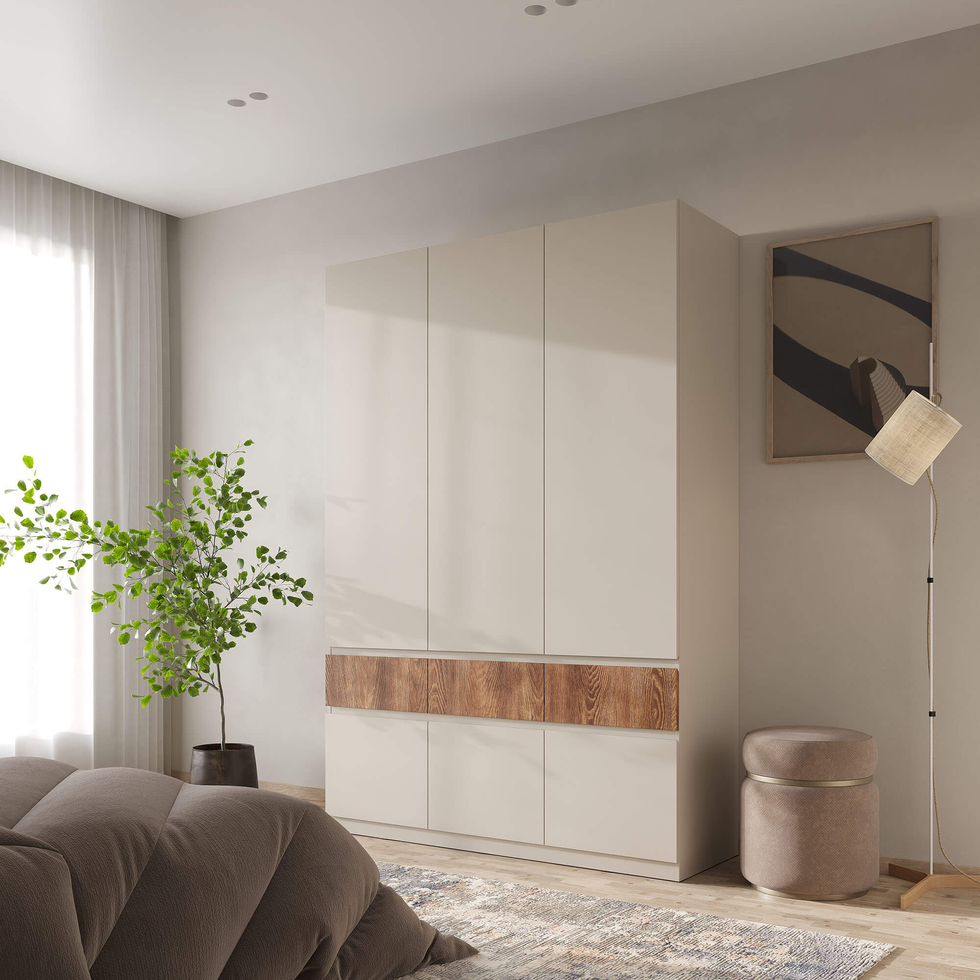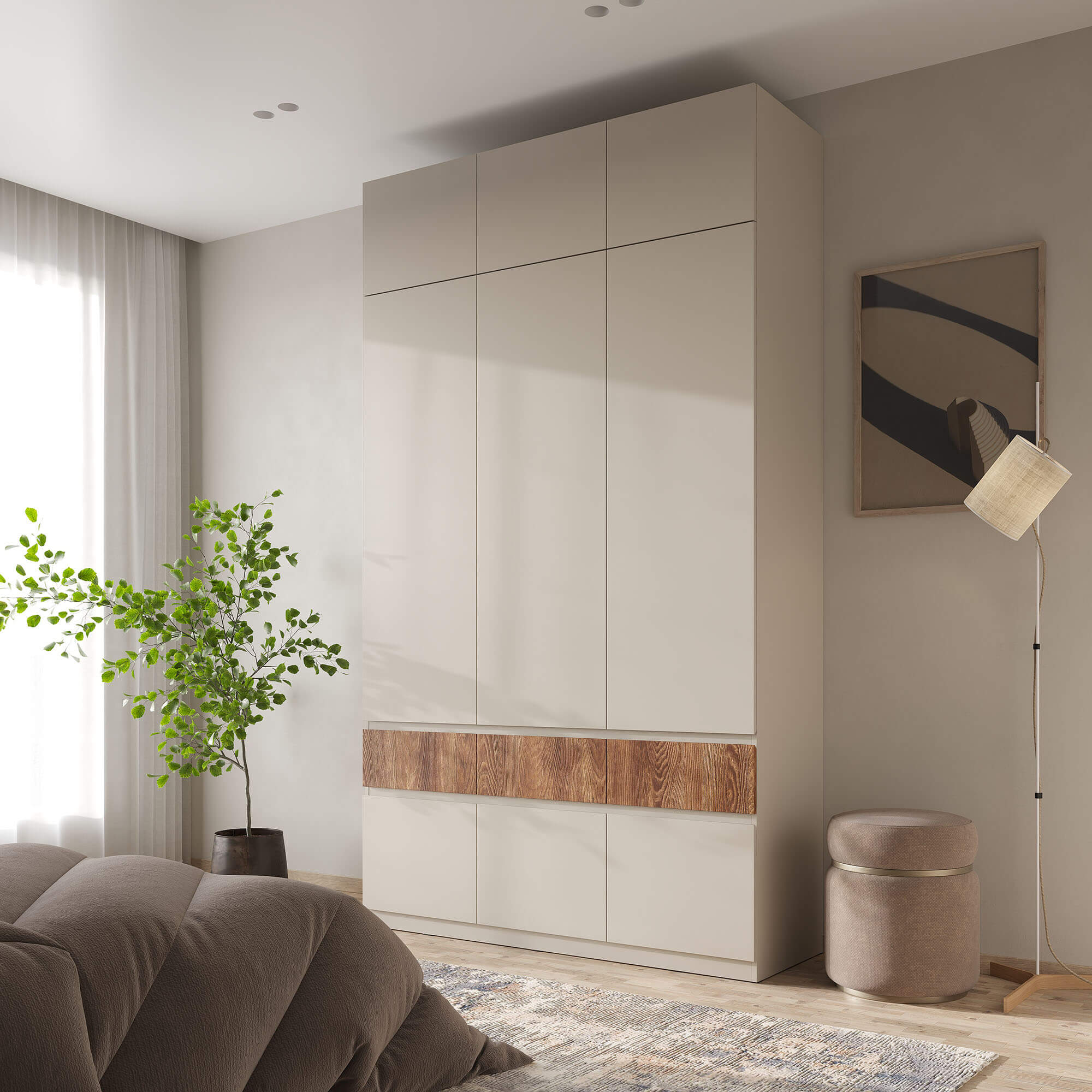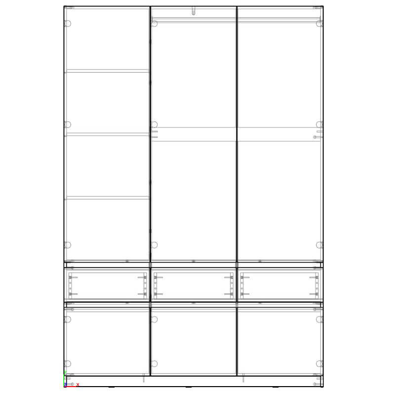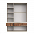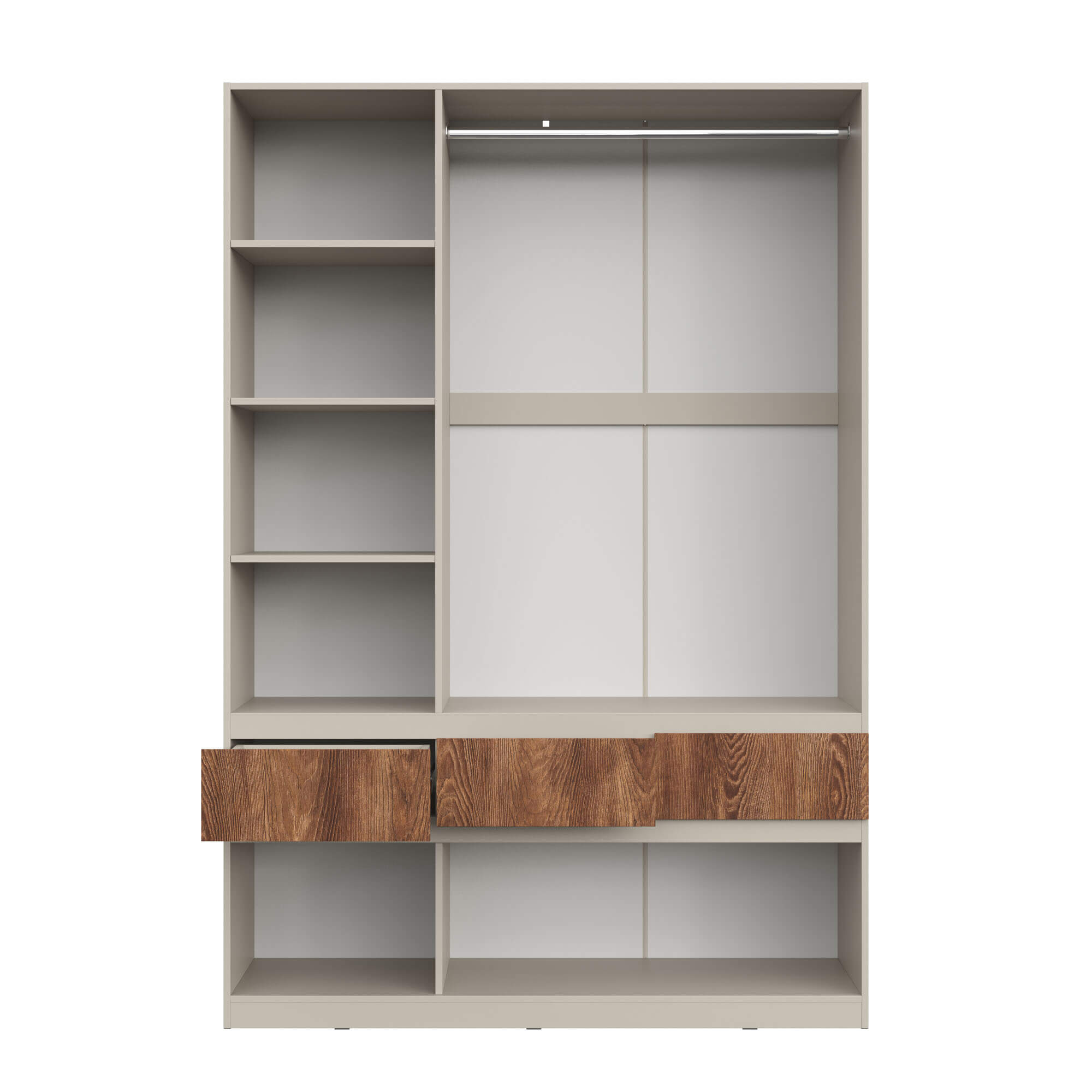 Функциональность: внутреннее пространство шкафов включает полки для одежды, полноценную штангу, ящики для мелочей и отдельные ниши под обувь, что позволяет эффективно организовать хранение.