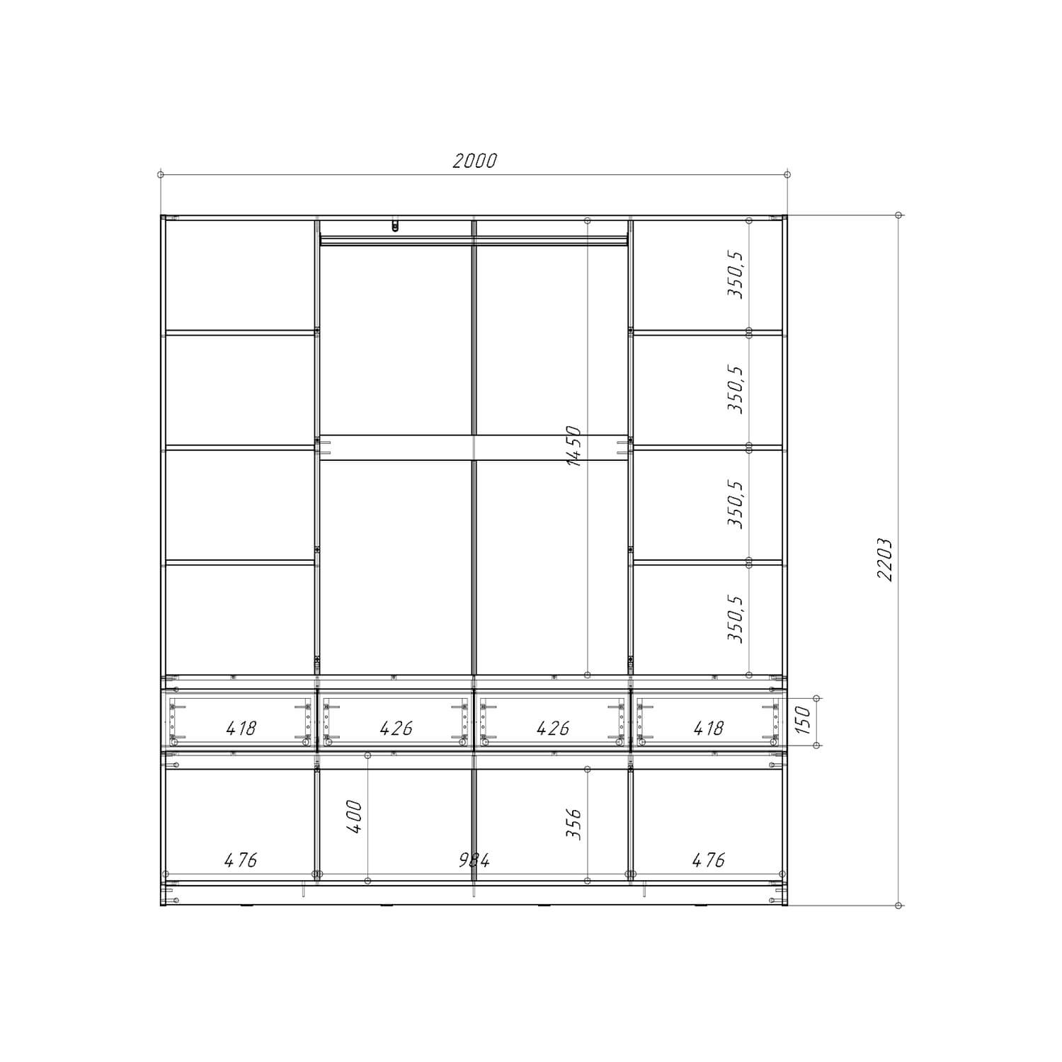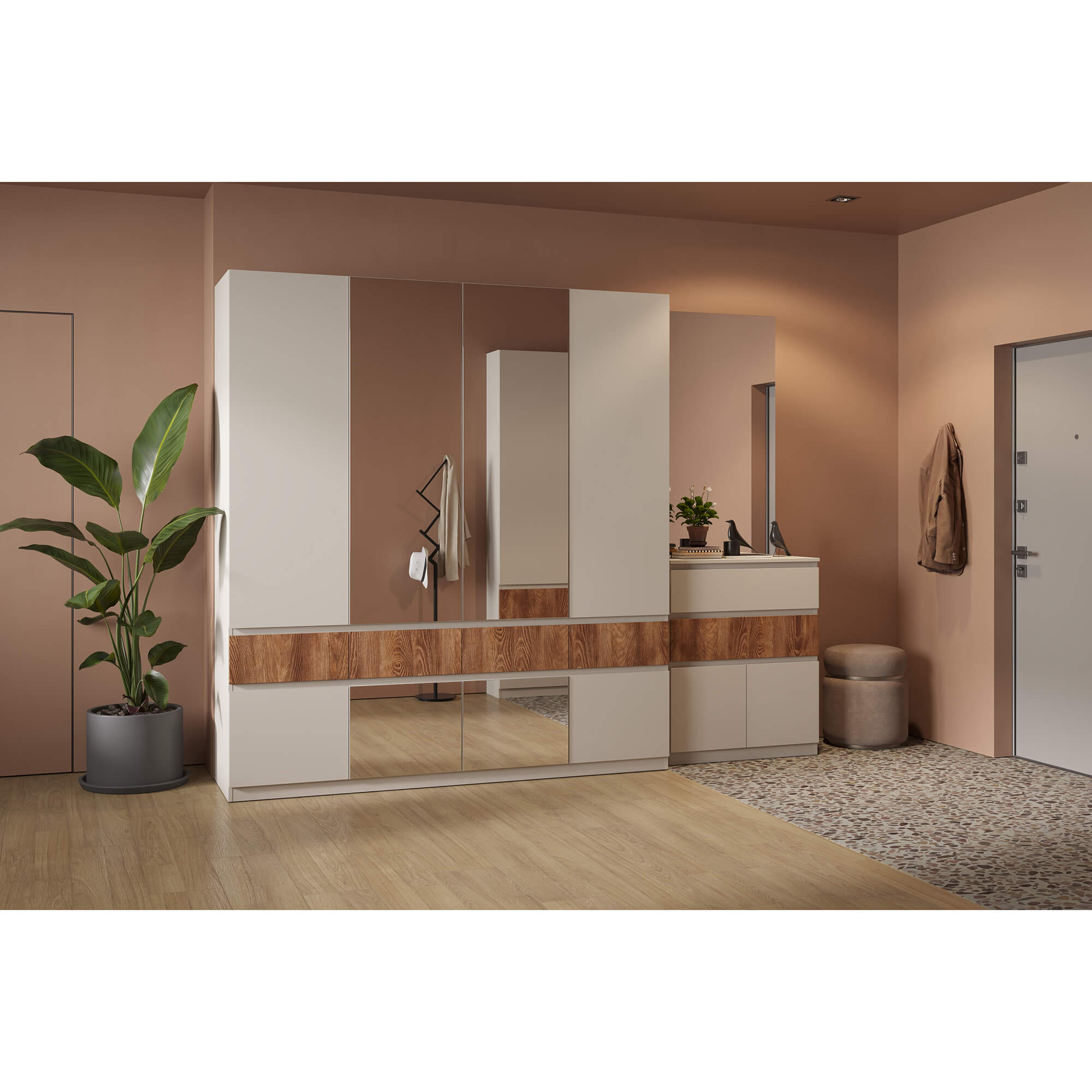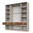 Функциональность: внутреннее пространство шкафов включает полки для одежды, полноценную штангу, ящики для мелочей и отдельные ниши под обувь, что позволяет эффективно организовать хранение.