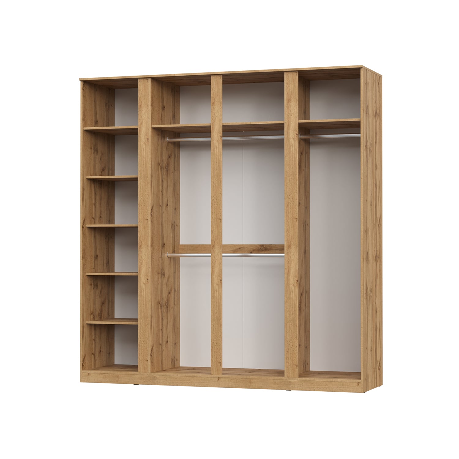 Шкаф оснащен 7 полками, что позволяет разместить большое количество вещей. В комплекте идут три штанги для вешалок, что обеспечивает дополнительное пространство для хранения.