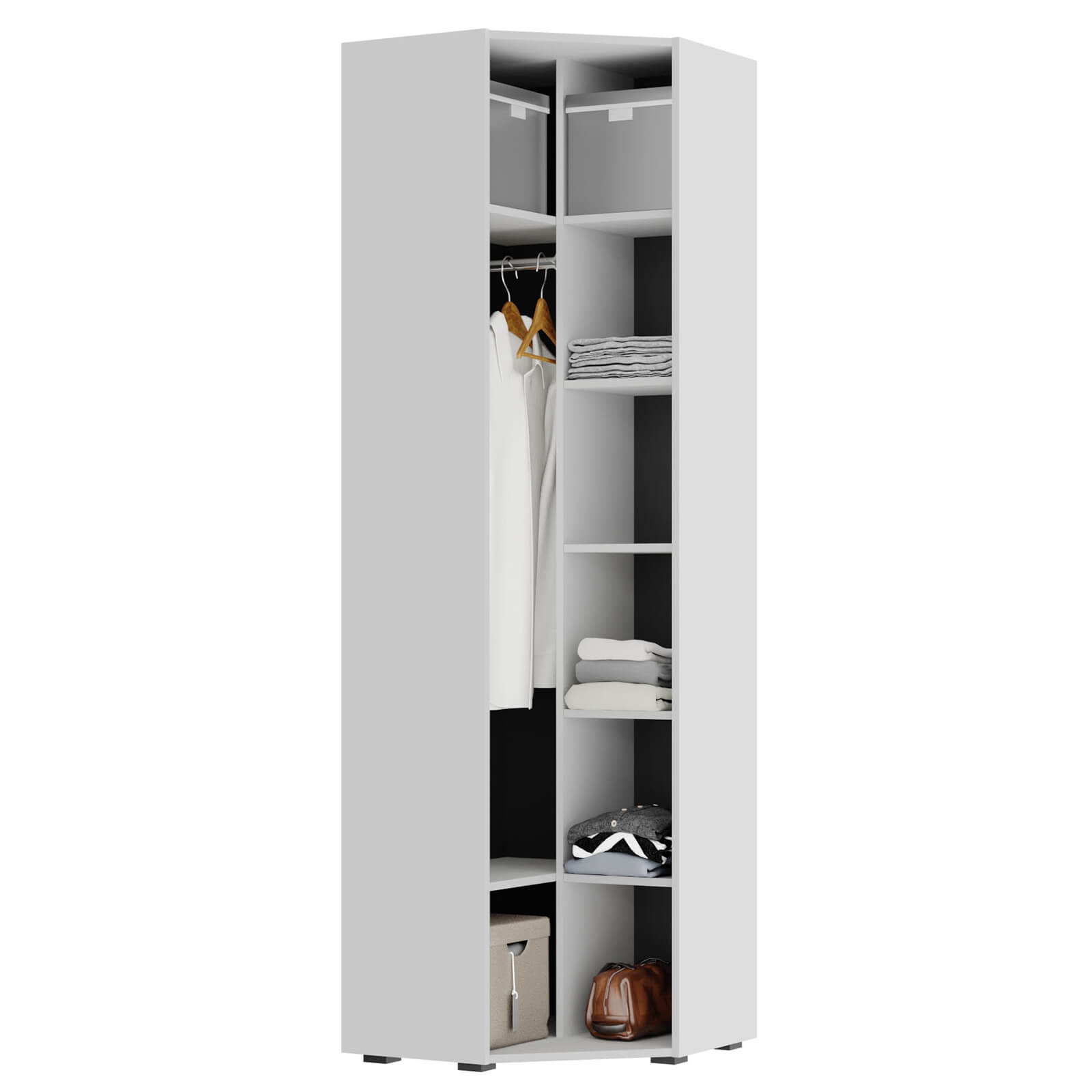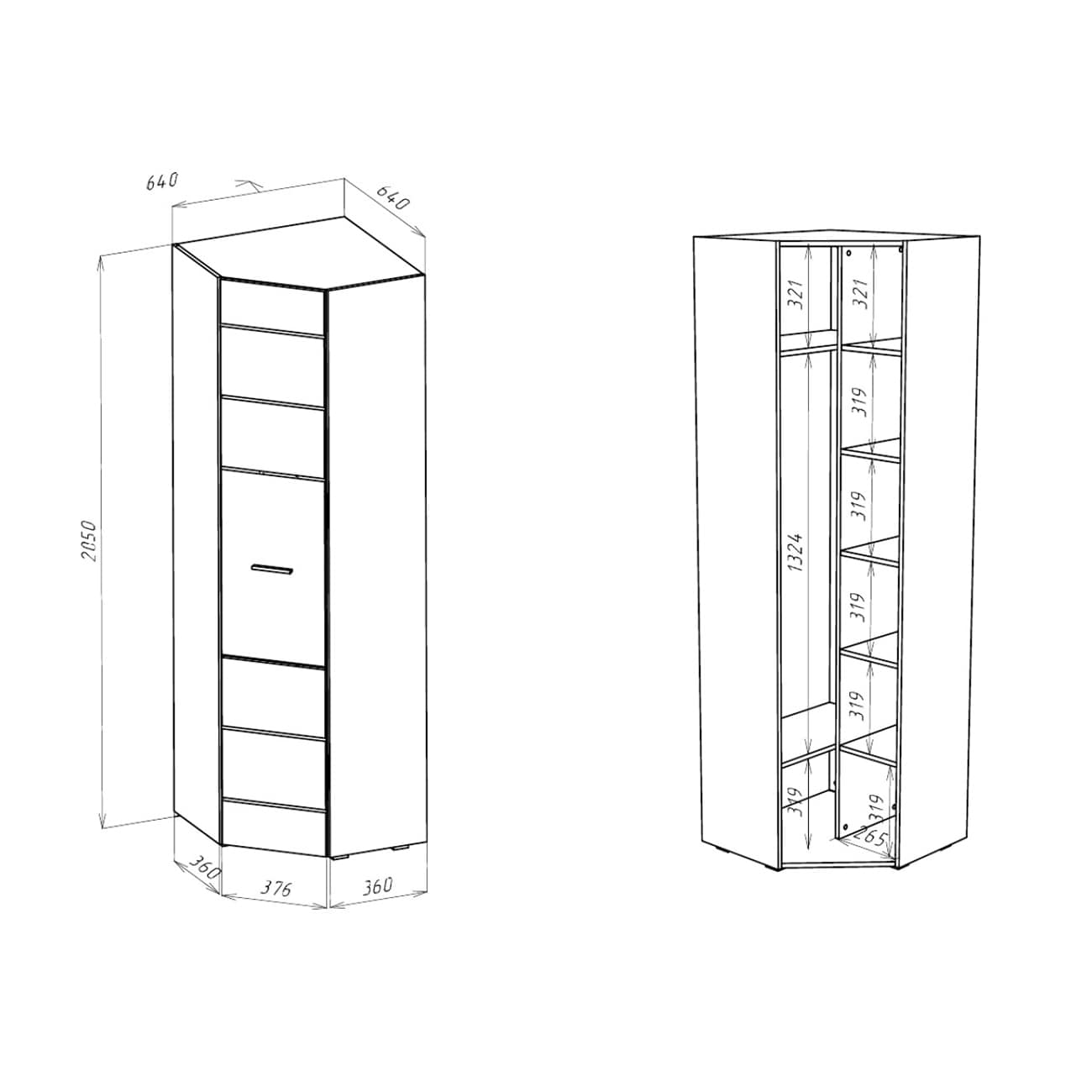 Особенностью шкафа является его угловая конструкция, которая позволяет максимально использовать пространство в углу комнаты. Шкаф оснащен одной распашной дверью с доводчиками, обеспечивающими плавное и бесшумное закрывание.