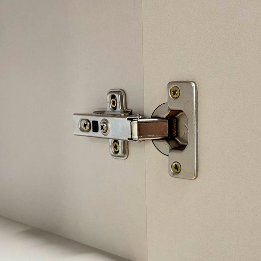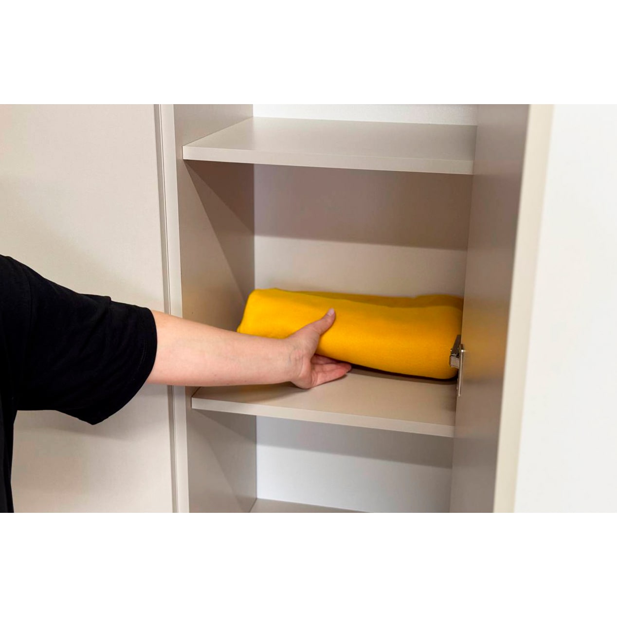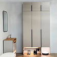 Шкаф оснащен накладными петлями с доводчиком от Боярд, которые обеспечивают плавное и бесшумное закрывание дверей. Наполнение в виде полок предоставляет удобный доступ к одежде, позволяя легко организовать внутреннее пространство.